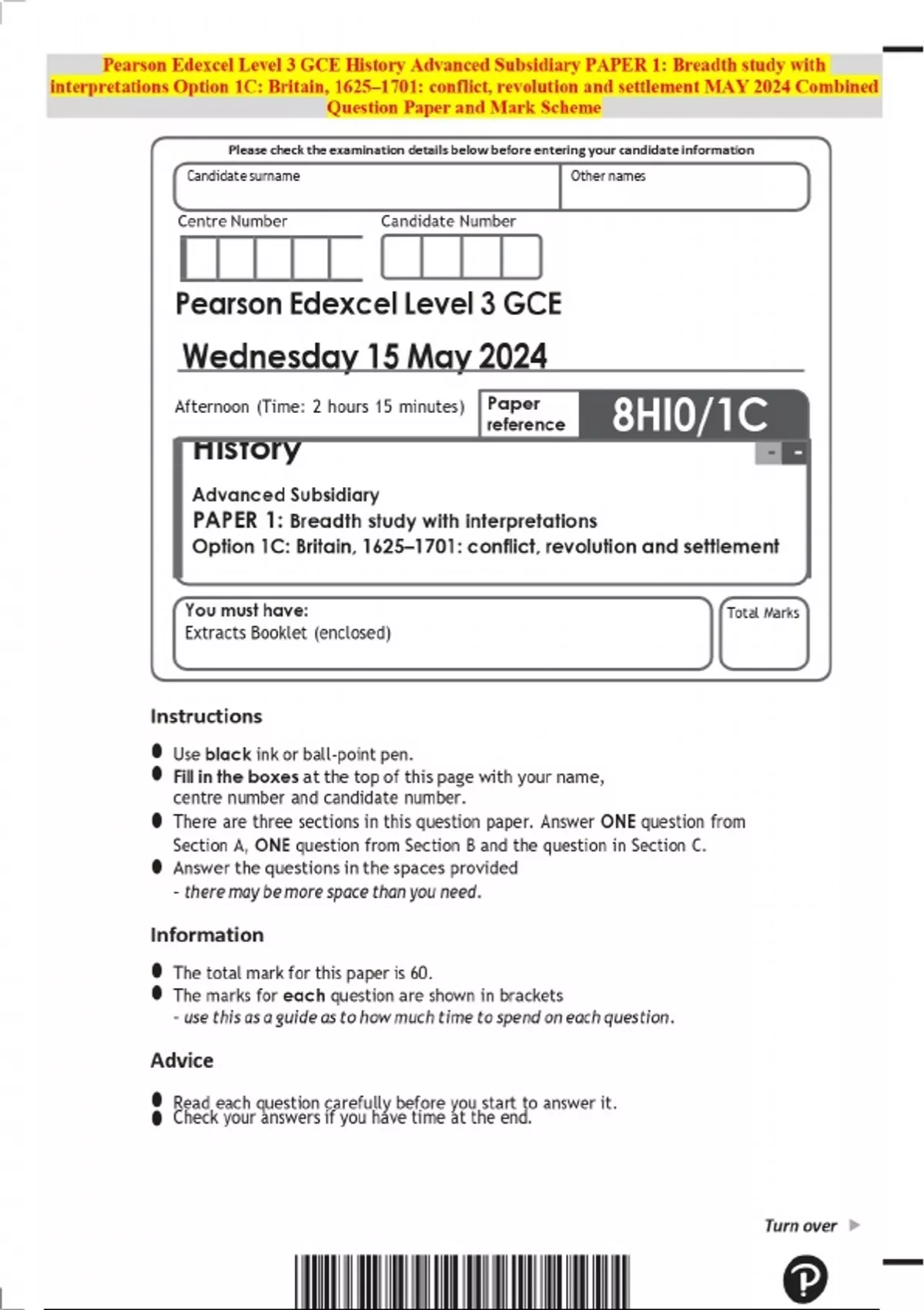 Pearson Edexcel Level 3 GCE History Advanced Subsidiary PAPER 1: Breadth study with interpretations Option 1C: Britain, 1625–1701: conflict, revolution and settlement MAY 2024 Combined Question Paper and Mark Scheme