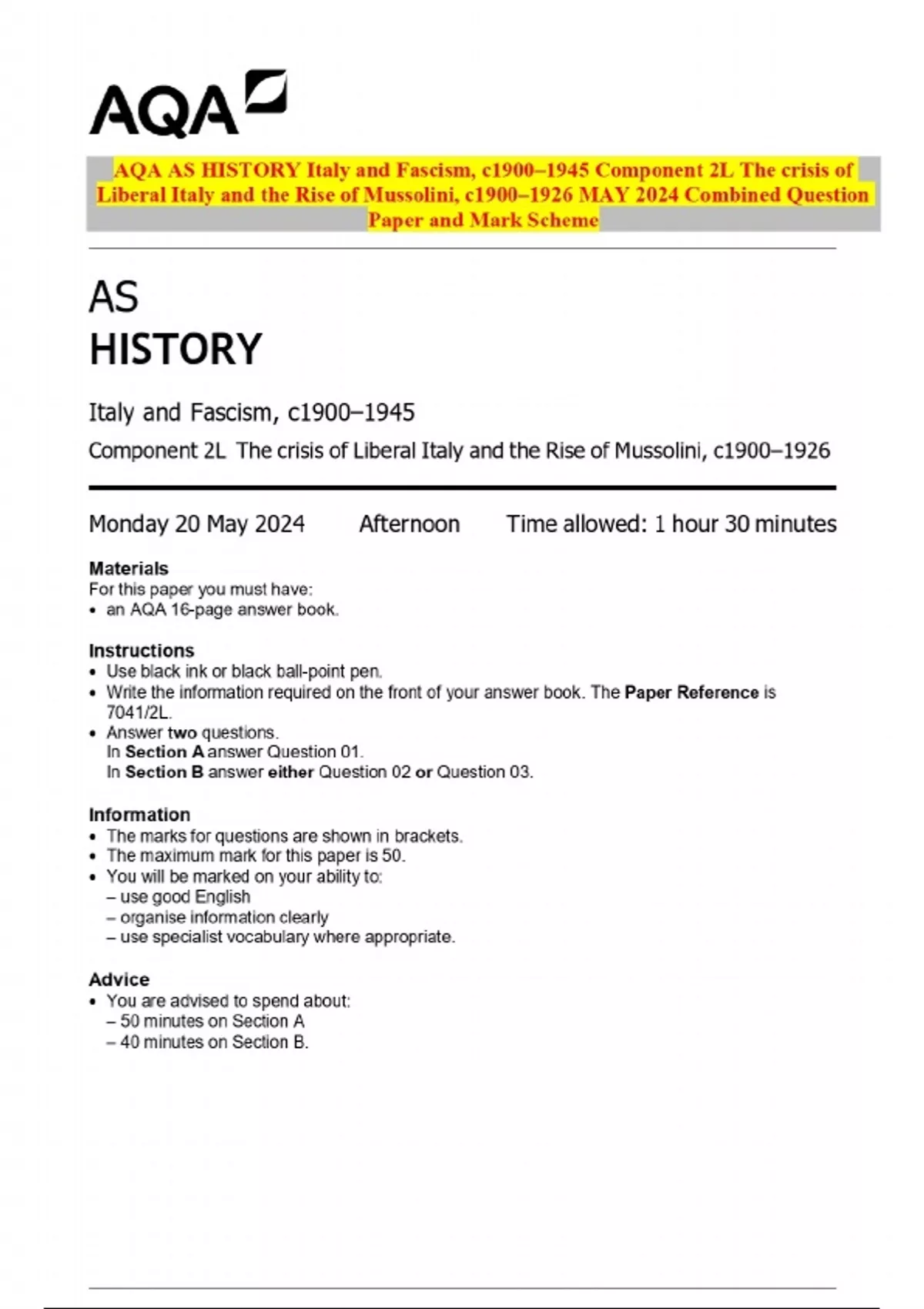 AQA AS HISTORY Italy and Fascism, c1900–1945 Component 2L The crisis of Liberal Italy and the Rise of Mussolini, c1900–1926 MAY 2024 Combined Question Paper and Mark Scheme