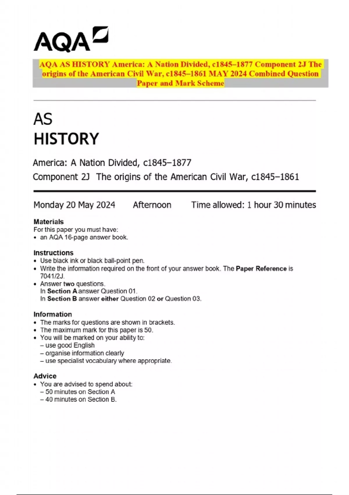 AQA AS HISTORY America: A Nation Divided, c1845–1877 Component 2J The origins of the American Civil War, c1845–1861 MAY 2024 Combined Question Paper and Mark Scheme