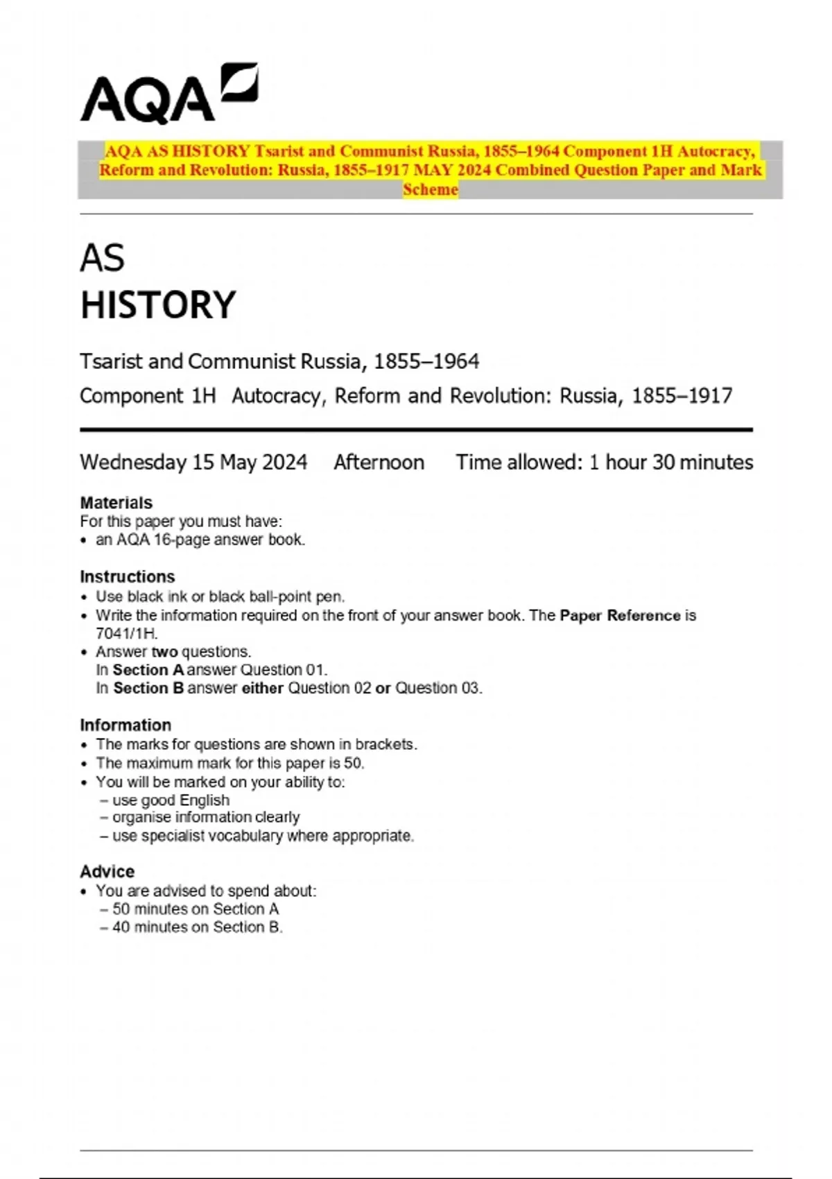 AQA AS HISTORY Tsarist and Communist Russia, 1855–1964 Component 1H Autocracy, Reform and Revolution: Russia, 1855–1917 MAY 2024 Combined Question Paper and Mark Scheme
