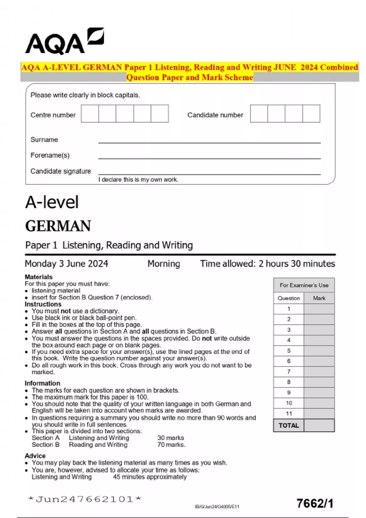 AQA A-LEVEL GERMAN Paper 1 Listening, Reading and Writing JUNE 2024 Combined Question Paper and Mark Scheme