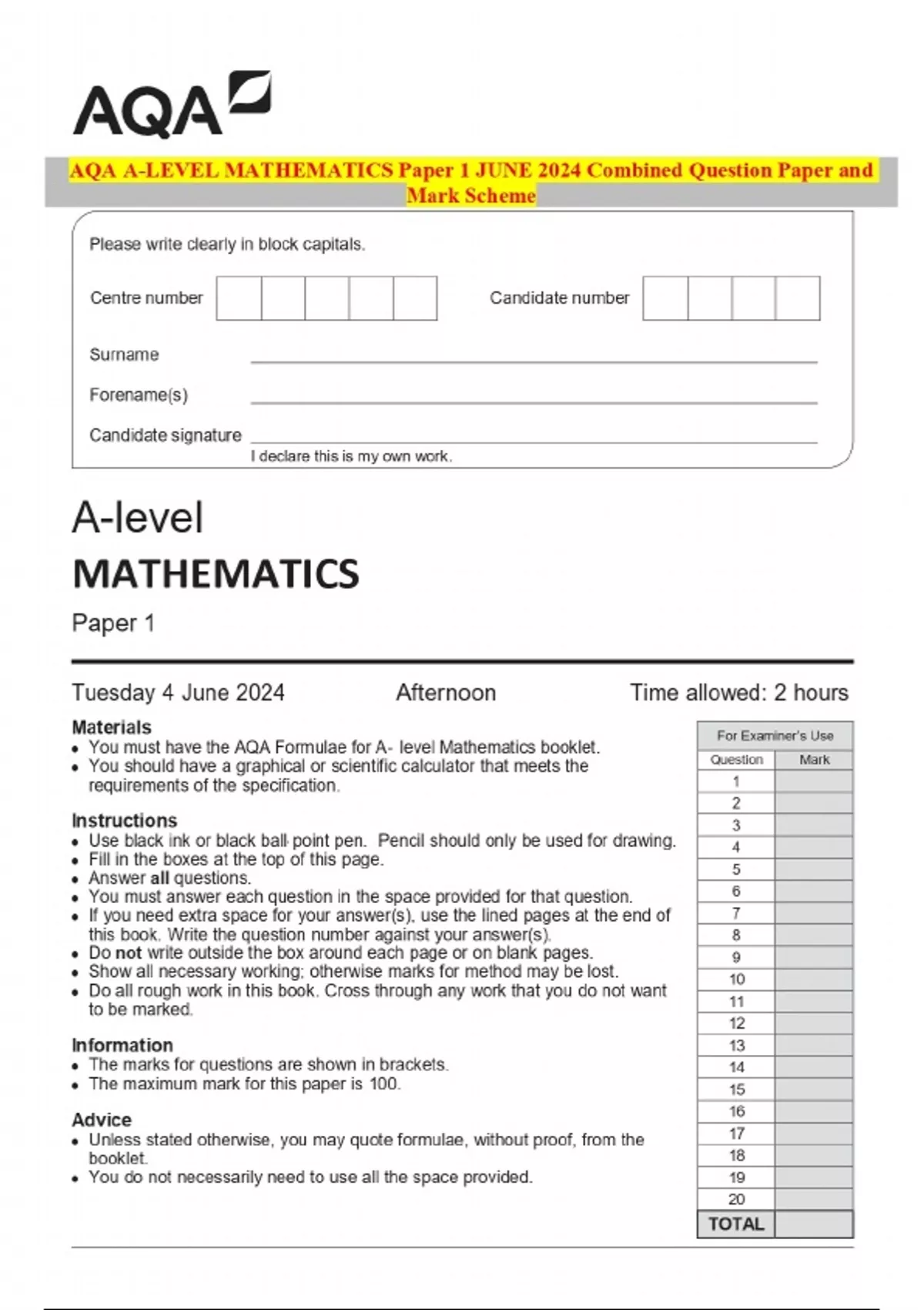 AQA A-LEVEL MATHEMATICS Paper 1 JUNE 2024 Combined Question Paper and Mark Scheme