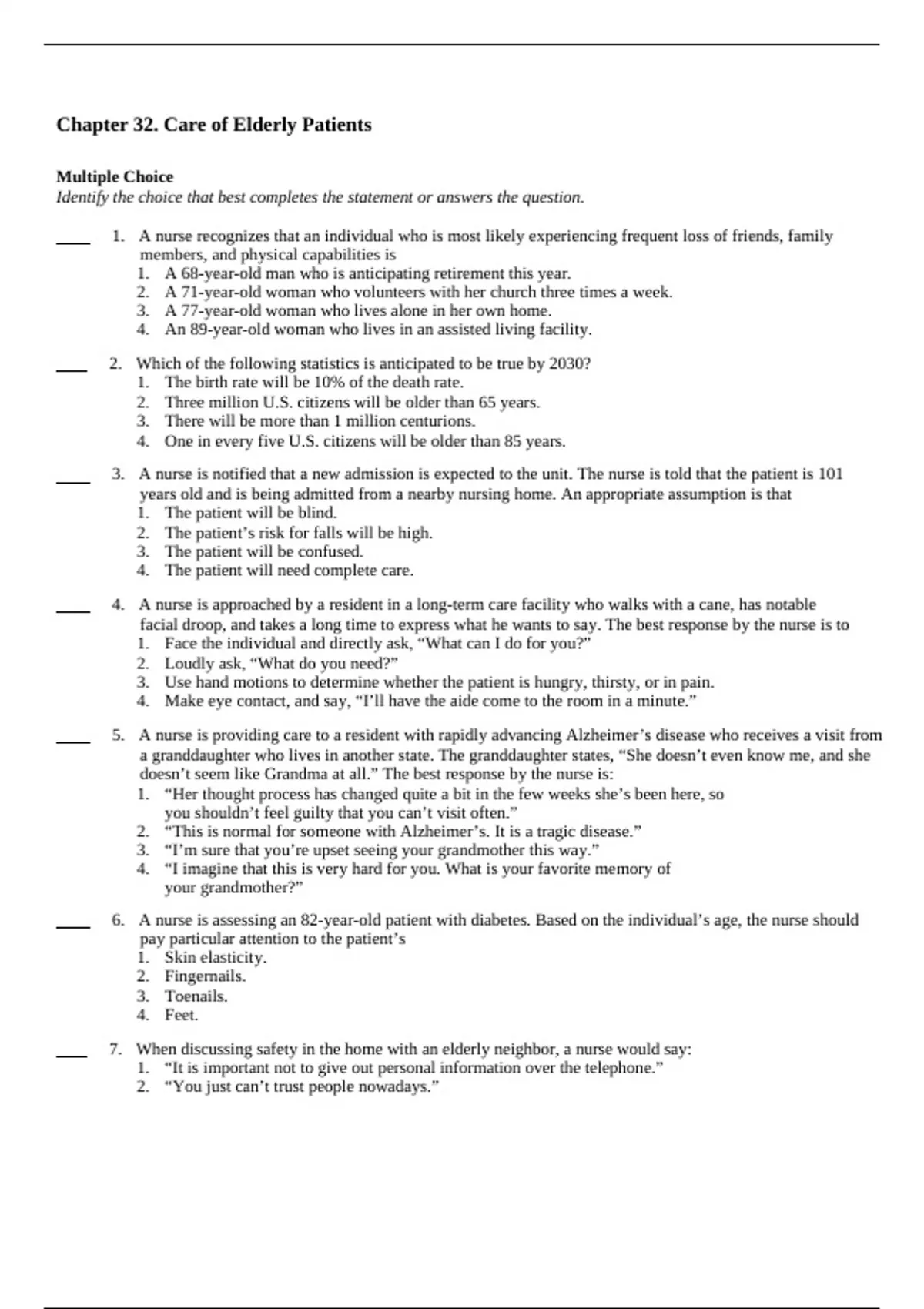 6. A nurse is assessing an 82-year-old patient with diabetes. Based on the individual’s age, the nurse should