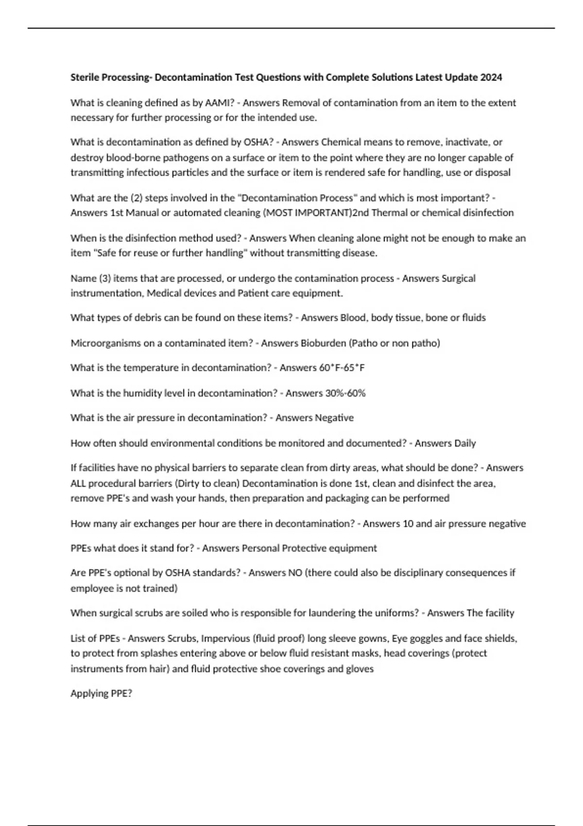 Sterile Processing- Decontamination Test Questions with Complete Solutions Latest Update 2024