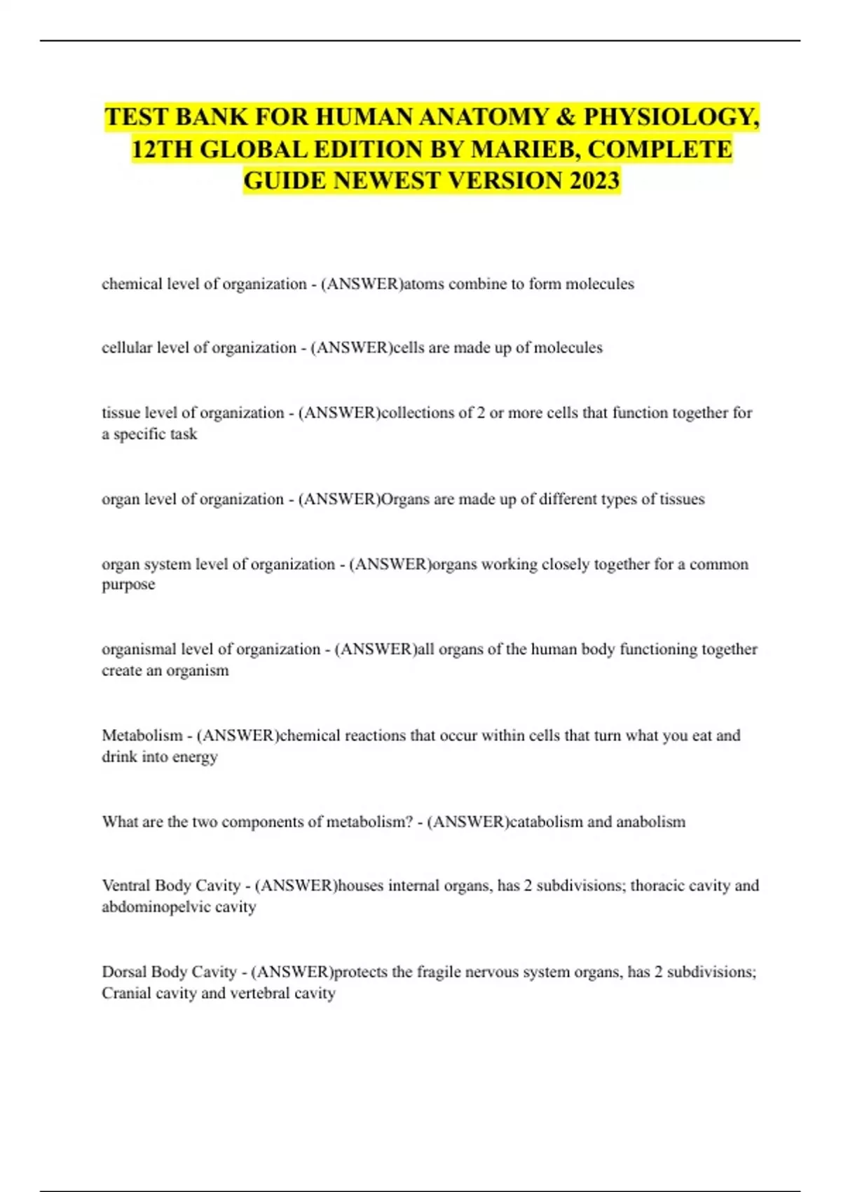 TEST BANK FOR HUMAN ANATOMY & PHYSIOLOGY, 12TH GLOBAL EDITION BY MARIEB, COMPLETE GUIDE NEWEST VERSION 2023