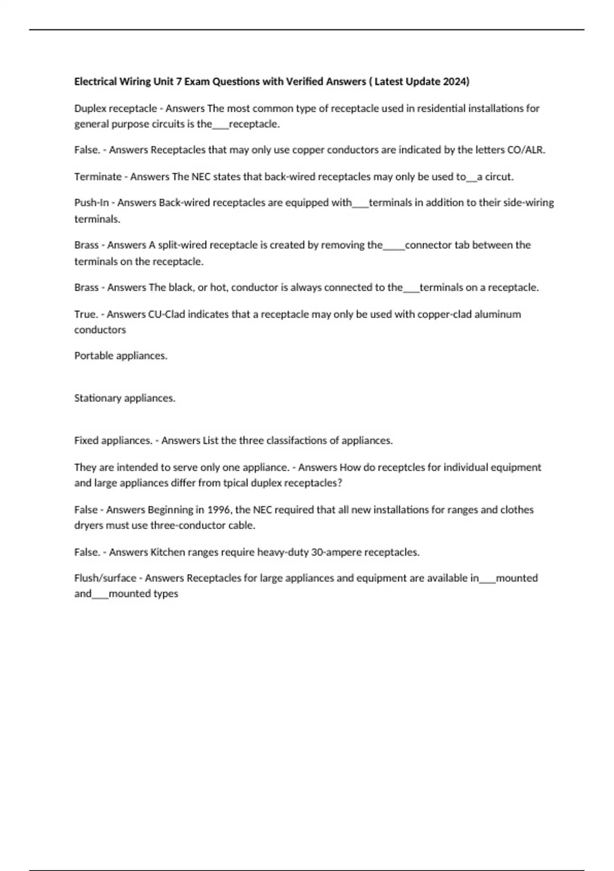 Electrical Wiring Unit 7 Exam Questions with Verified Answers ( Latest Update 2024) Duplex receptacle - Answers The most common type of receptacle used in residential installations for general purpose circuits is the___receptacle. False. - Answers Receptacles that may only use copper conductors are indicated by the letters CO/ALR. Terminate - Answers The NEC states that back-wired receptacles may only be used to__a circut. Push-In - Answers Back-wired receptacles are equipped with___terminals in addition to their side-wiring terminals. Brass - Answers A split-wired receptacle is created by removing the____connector tab between the terminals on the receptacle. Brass - Answers The black, or hot, conductor is always connected to the___terminals on a receptacle. True. - Answers CU-Clad indicates that a receptacle may only be used with copper-clad aluminum conductors Portable appliances.