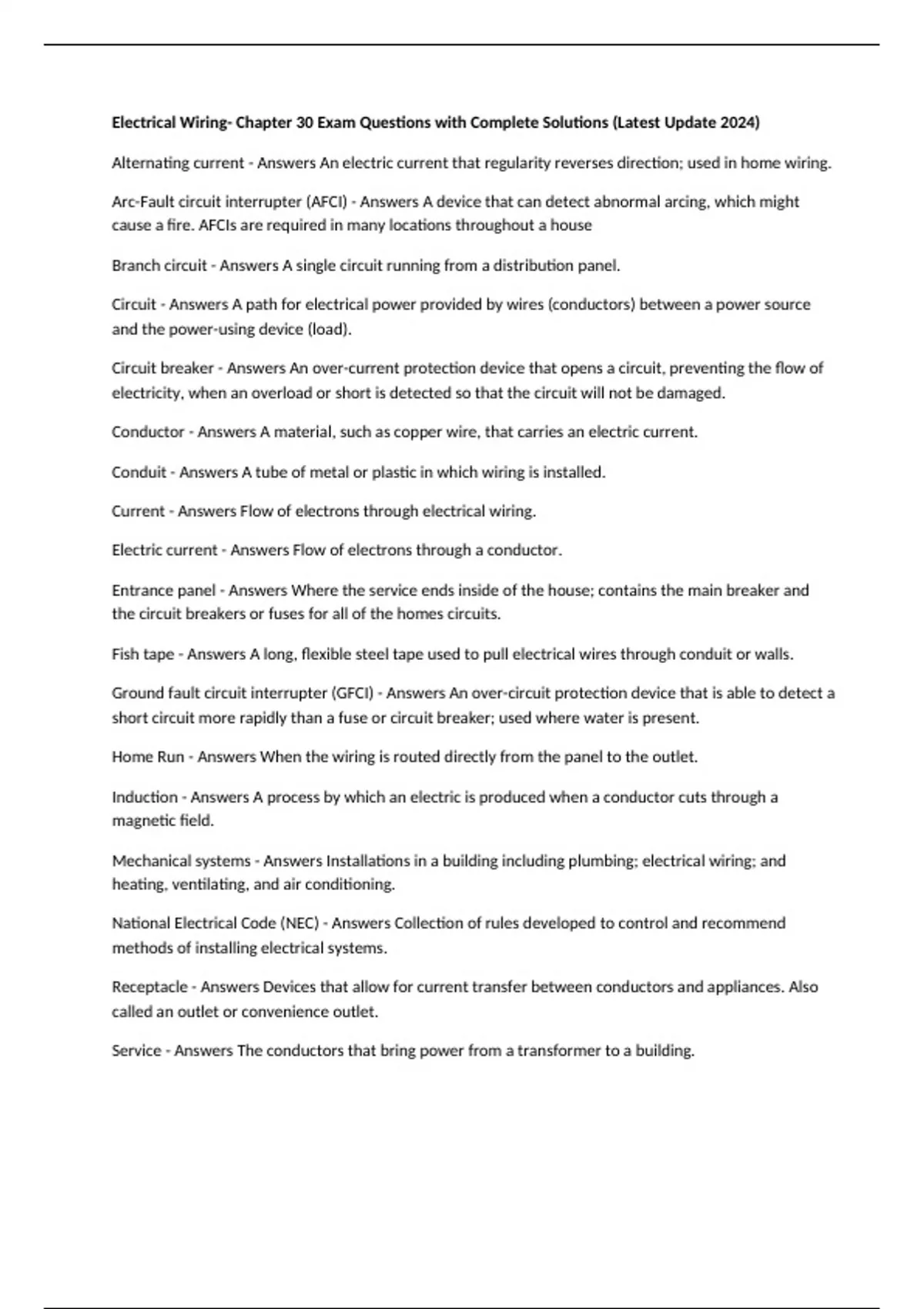 Electrical Wiring- Chapter 30 Exam Questions with Complete Solutions (Latest Update 2024) Alternating current - Answers An electric current that regularity reverses direction; used in home wiring. Arc-Fault circuit interrupter (AFCI) - Answers A device that can detect abnormal arcing, which might cause a fire. AFCIs are required in many locations throughout a house Branch circuit - Answers A single circuit running from a distribution panel. Circuit - Answers A path for electrical power provided by wires (conductors) between a power source and the power-using device (load). Circuit breaker - Answers An over-current protection device that opens a circuit, preventing the flow of electricity, when an overload or short is detected so that the circuit will not be damaged. Conductor - Answers A material, such as copper wire, that carries an electric current. Conduit - Answers A tube of metal or plastic in which wiring is installed. Current - Answers Flow of electrons through electrical wiring. Electric current - Answers Flow of electrons through a conductor. Entrance panel - Answers Where the service ends inside of the house; contains the main breaker and the circuit breakers or fuses for all of the homes circuits. Fish tape - Answers A long, flexible steel tape used to pull electrical wires through conduit or walls. Ground fault circuit interrupter (GFCI) - Answers An over-circuit protection device that is able to detect a short circuit more rapidly than a fuse or circuit breaker; used where water is present. Home Run - Answers When the wiring is routed directly from the panel to the outlet. Induction - Answers A process by which an electric is produced when a conductor cuts through a magnetic field.