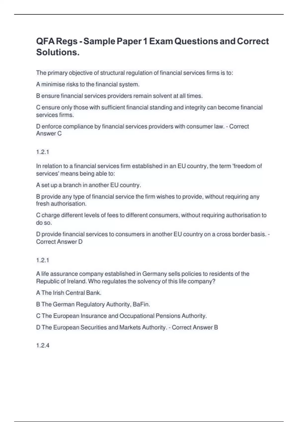 QFARegs -SamplePaper 1ExamQuestionsandCorrect Solutions. The primary objective of structural regulation of financial services firms is to: A minimise risks to the financial system. B ensure financial services providers remain solvent at all times. C ensure only those with sufficient financial standing and integrity can become financial services firms. D enforce compliance by financial services providers with consumer law. - Correct Answer C 1.2.1 In relation to a financial services firm established in an EU country, the term 'freedom of services' means being able to: A set up a branch in another EU country