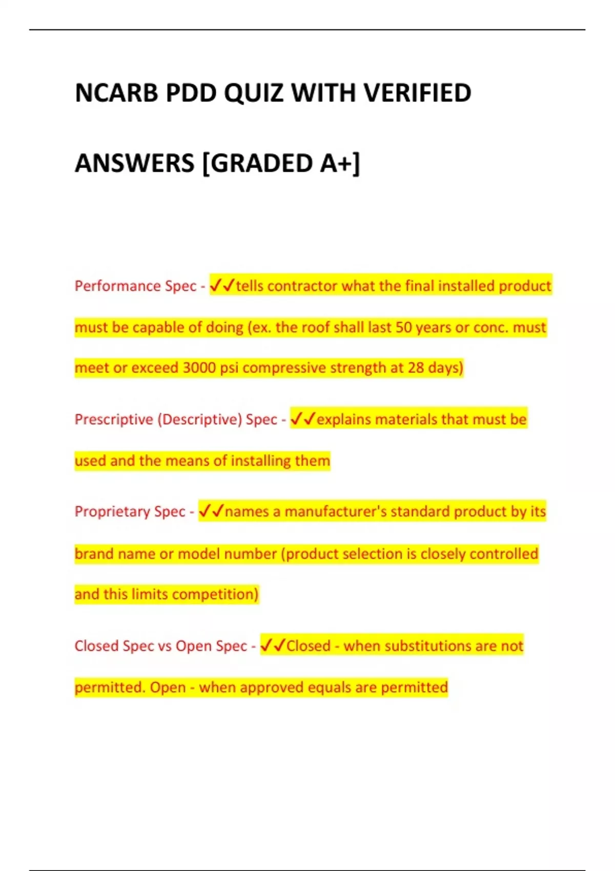 NCARB PDD QUIZ WITH VERIFIED ANSWERS [GRADED A+] Performance Spec - tells contractor what the final installed product must be capable of doing (ex. the roof shall last 50 years or conc. must meet or exceed 3000 psi compressive strength at 28 days) Prescriptive (Descriptive) Spec - explains materials that must be used and the means of installing them Proprietary Spec - names a manufacturer's standard product by its brand name or model number (product selection is closely controlled and this limits competition) Closed Spec vs Open Spec - Closed - when substitutions are not permitted. Open - when approved equals are permitted