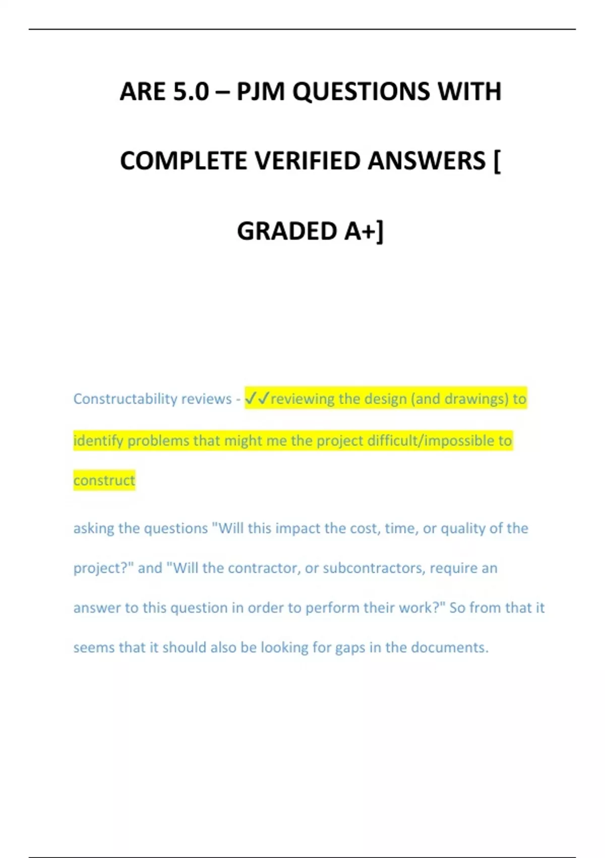 ARE 5.0 – PJM QUESTIONS WITH COMPLETE VERIFIED ANSWERS [ GRADED A+] Constructability reviews - reviewing the design (and drawings) to identify problems that might me the project difficult/impossible to construct asking the questions "Will this impact the cost, time, or quality of the project?" and "Will the contractor, or subcontractors, require an answer to this question in order to perform their work?" So from that it seems that it should also be looking for gaps in the documents.