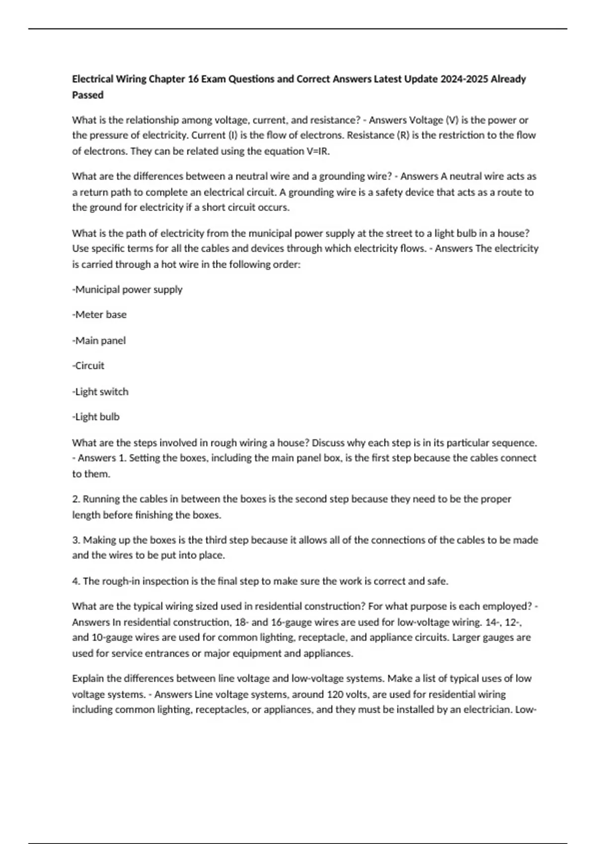 Electrical Wiring Chapter 16 Exam Questions and Correct Answers Latest Update Already Passed What is the relationship among voltage, current, and resistance? - Answers Voltage (V) is the power or the pressure of electricity. Current (I) is the flow of electrons. Resistance (R) is the restriction to the flow of electrons. They can be related using the equation V=IR. What are the differences between a neutral wire and a grounding wire? - Answers A neutral wire acts as a return path to complete an electrical circuit. A grounding wire is a safety device that acts as a route to the ground for electricity if a short circuit occurs. What is the path of electricity from the municipal power supply at the street to a light bulb in a house? Use specific terms for all the cables and devices through which electricity flows. - Answers The electricity is carried through a hot wire in the following order: -Municipal power supply -Meter base -Main panel -Circuit -Light switch -Light bulb What are the steps involved in rough wiring a house? Discuss why each step is in its particular sequence. - Answers 1. Setting the boxes, including the main panel box, is the first step because the cables connect to them. 2. Running the cables in between the boxes is the second step because they need to be the proper length before finishing the boxes. 3. Making up the boxes is the third step because it allows all of the connections of the cables to be made and the wires to be put into place. 4. The rough-in inspection is the final step to make sure the work is correct and safe.