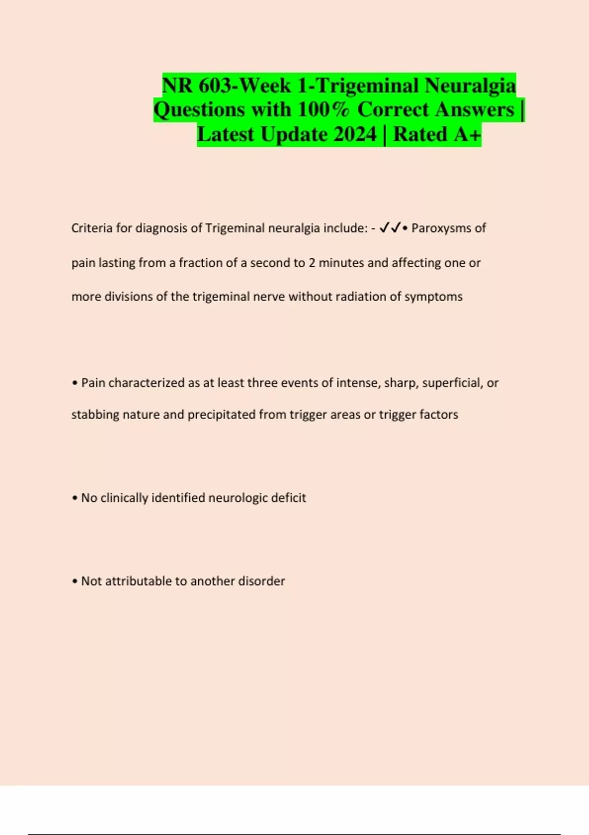 Criteria for diagnosis of Trigeminal neuralgia include: - ✔✔• Paroxysms of