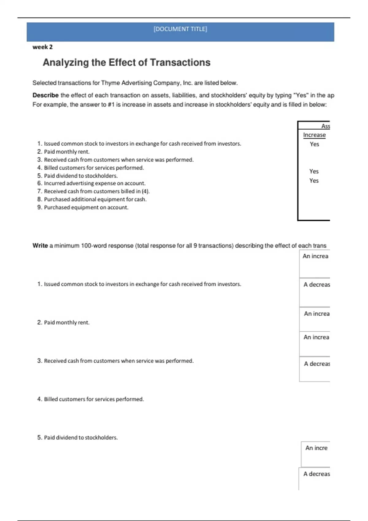 Write a minimum 100-word response (total response for all 9 transactions) describing the effect of each trans
