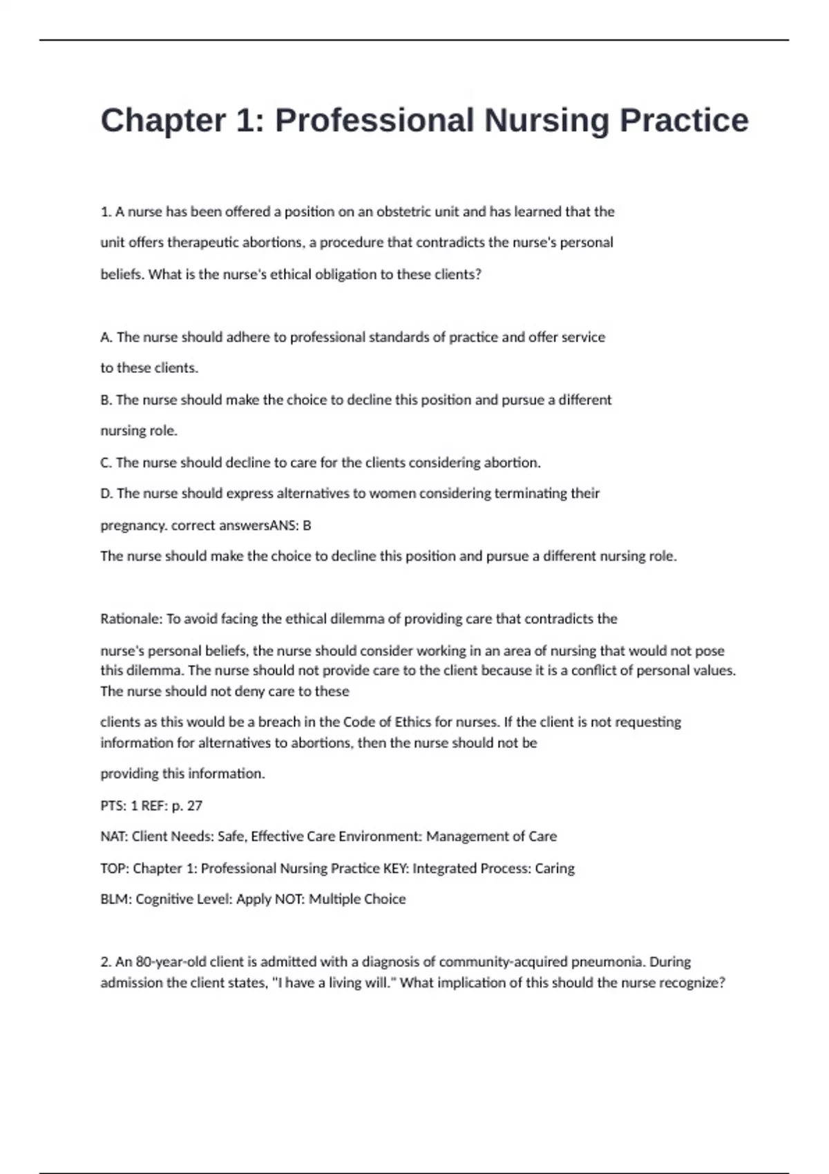 1. A nurse has been offered a position on an obstetric unit and has learned that the unit offers therapeutic abortions, a procedure that contradicts the nurse's personal beliefs. What is the nurse's ethical obligation to these clients? A. The nurse should adhere to professional standards of practice and offer service to these clients. B. The nurse should make the choice to decline this position and pursue a different nursing role. C. The nurse should decline to care for the clients considering abortion. D. The nurse should express alternatives to women considering terminating their pregnancy. correct answersANS: B The nurse should make the choice to decline this position and pursue a different nursing role. Rationale: To avoid facing the ethical dilemma of providing care that contradicts the nurse's personal beliefs, the nurse should consider working in an area of nursing that would not pose this dilemma. The nurse should not provide care to the client because it is a conflict of personal values. The nurse should not deny care to these clients as this would be a breach in the Code of Ethics for nurses. If the client is not requesting information for alternatives to abortions, then the nurse should not be providing this information. PTS: 1 REF: p. 27 NAT: Client Needs: Safe, Effective Care Environment: Management of Care TOP: Chapter 1: Professional Nursing Practice KEY: Integrated Process: Caring BLM: Cognitive Level: Apply NOT: Multiple Choice 2. An 80-year-old client is admitted with a diagnosis of community-acquired pneumonia. During admission the client states, "I have a living will." What implication of this should the nurse recognize?