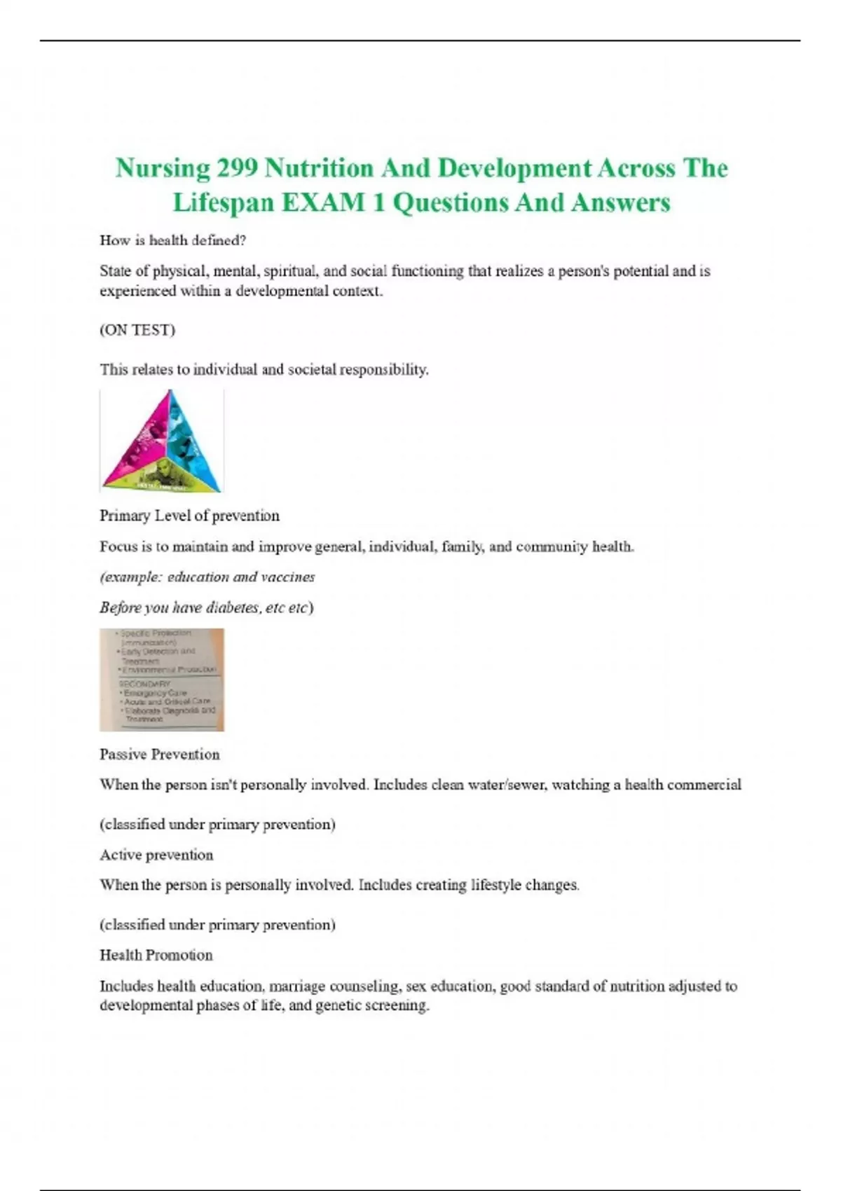 Nursing 299 Nutrition And Development Across The Lifespan EXAM 1 Questions And Answers How is health defined? State of physical, mental, spiritual, and social functioning that realizes a person's potential and is experienced within a developmental context. (ON TEST) This relates to individual and societal responsibility.