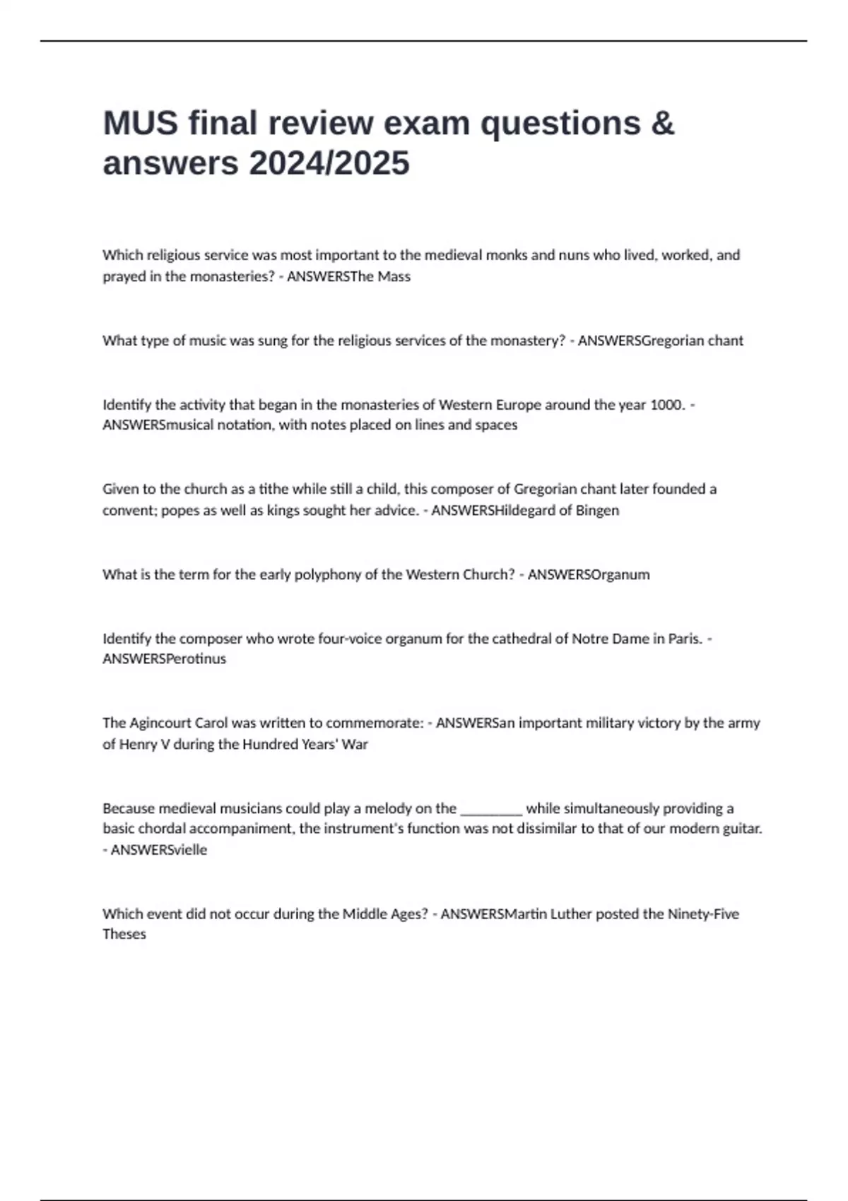 MUS final review exam questions & answers 2024/2025 Which religious service was most important to the medieval monks and nuns who lived, worked, and prayed in the monasteries? - ANSWERSThe Mass What type of music was sung for the religious services of the monastery? - ANSWERSGregorian chant Identify the activity that began in the monasteries of Western Europe around the year 1000. - ANSWERSmusical notation, with notes placed on lines and spaces Given to the church as a tithe while still a child, this composer of Gregorian chant later founded a convent; popes as well as kings sought her advice. - ANSWERSHildegard of Bingen What is the term for the early polyphony of the Western Church? - ANSWERSOrganum Identify the composer who wrote four-voice organum for the cathedral of Notre Dame in Paris. - ANSWERSPerotinus The Agincourt Carol was written to commemorate: - ANSWERSan important military victory by the army of Henry V during the Hundred Years' War Because medieval musicians could play a melody on the ________ while simultaneously providing a basic chordal accompaniment, the instrument's function was not dissimilar to that of our modern guitar. - ANSWERSvielle Which event did not occur during the Middle Ages? - ANSWERSMartin Luther posted the Ninety-Five Theses