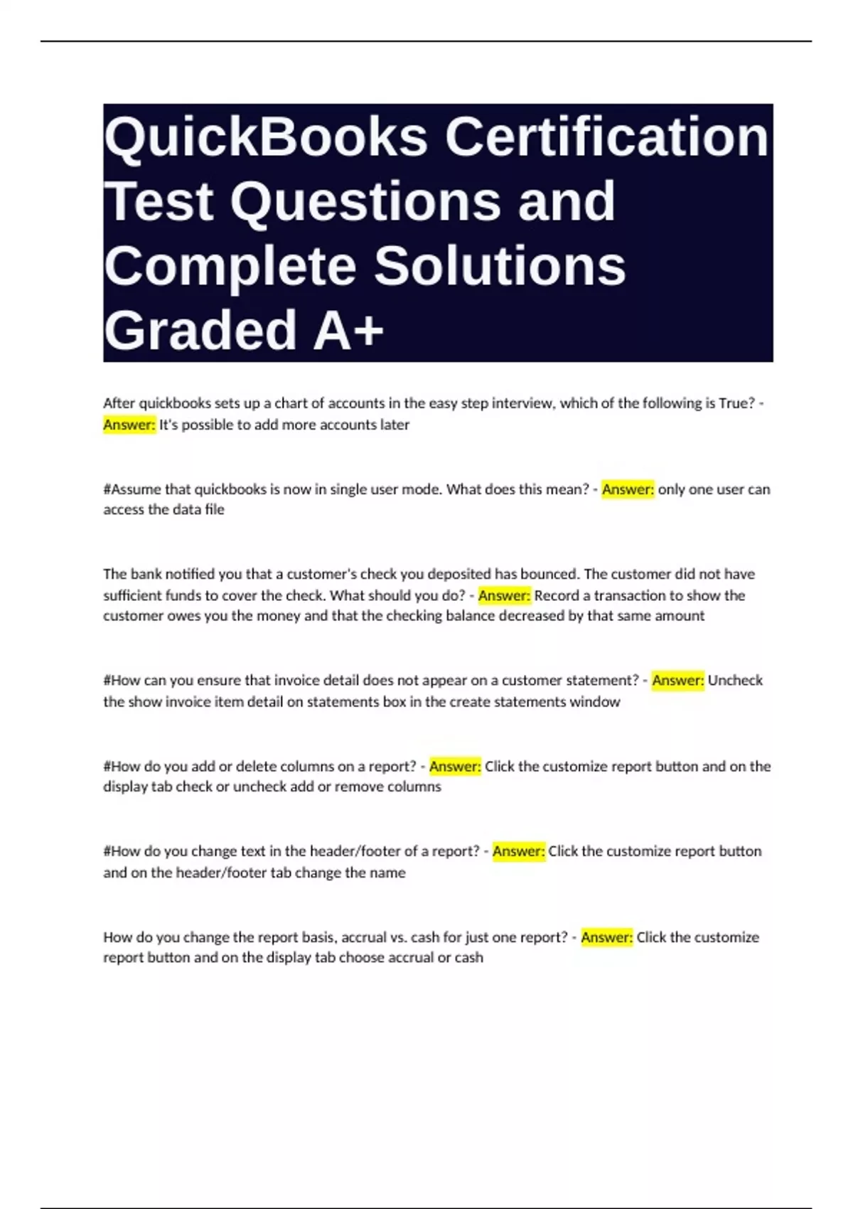 QuickBooks Certification Test Questions and Complete Solutions Graded A+