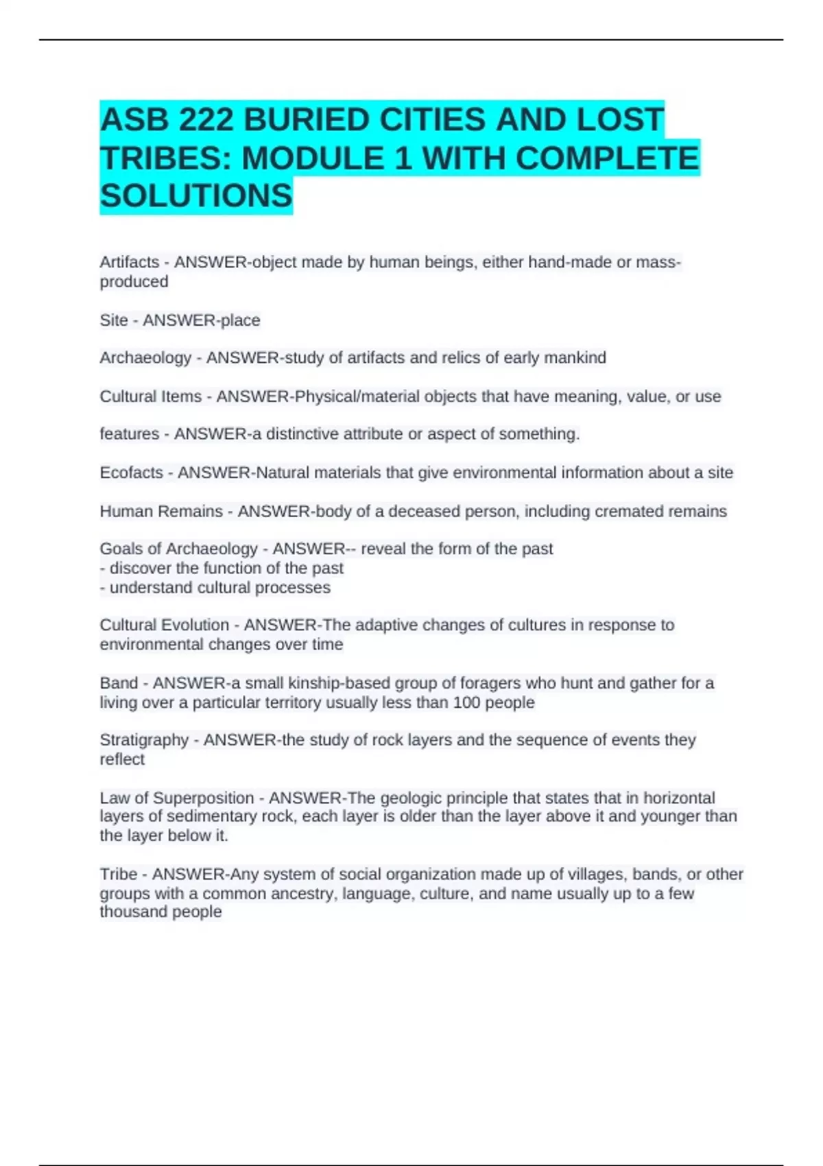ASB 222 BURIED CITIES AND LOST TRIBES: MODULE 1 WITH COMPLETE SOLUTIONSASB 222 BURIED CITIES AND LOST TRIBES: MODULE 1 WITH COMPLETE SOLUTIONSASB 222 BURIED CITIES AND LOST TRIBES: MODULE 1 WITH COMPLETE SOLUTIONSArtifacts - ANSWER-object made by human beings, either hand-made or mass-produced Site - ANSWER-place Archaeology - ANSWER-study of artifacts and relics of early mankind Cultural Items - ANSWER-Physical/material objects that have meaning, value, or use features - ANSWER-a distinctive attribute or aspect of something.