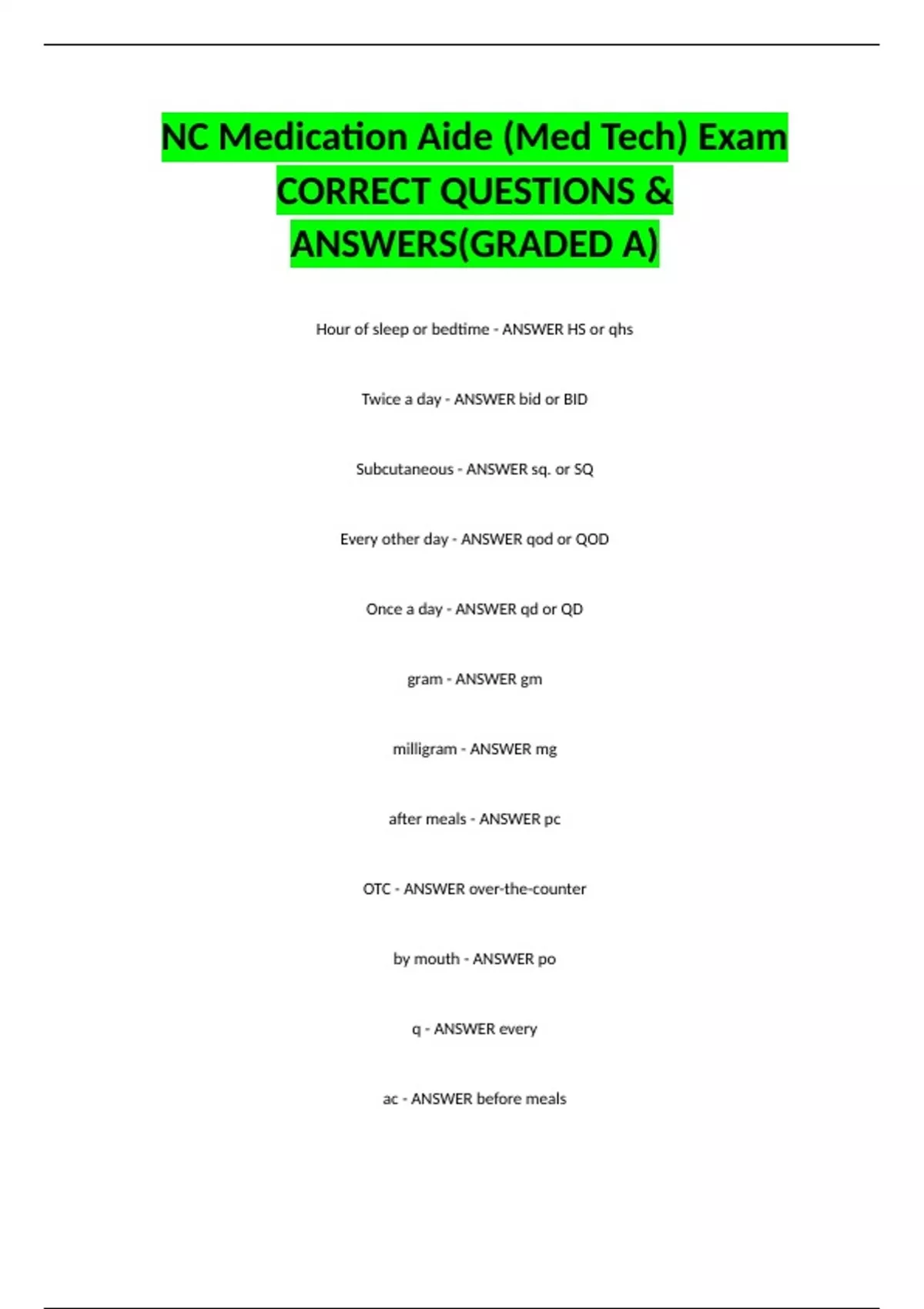 NC Medication Aide (Med Tech) Exam CORRECT QUESTIONS & ANSWERS(GRADED A)