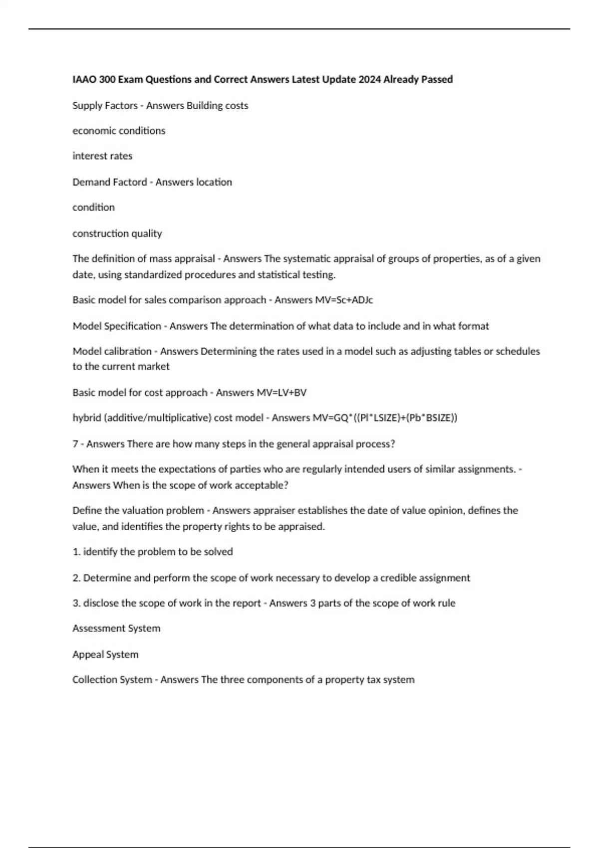 IAAO 300 Exam Questions and Correct Answers Latest Update 2024 Already Passed Supply Factors - Answers Building costs economic conditions interest rates Demand Factord - Answers location condition construction quality The definition of mass appraisal - Answers The systematic appraisal of groups of properties, as of a given date, using standardized procedures and statistical testing. Basic model for sales comparison approach - Answers MV=Sc+ADJc Model Specification - Answers The determination of what data to include and in what format Model calibration - Answers Determining the rates used in a model such as adjusting tables or schedules to the current market Basic model for cost approach - Answers MV=LV+BV hybrid (additive/multiplicative) cost model - Answers MV=GQ*((Pl*LSIZE)+(Pb*BSIZE)) 7 - Answers There are how many steps in the general appraisal process? When it meets the expectations of parties who are regularly intended users of similar assignments. - Answers When is the scope of work acceptable? Define the valuation problem - Answers appraiser establishes the date of value opinion, defines the value, and identifies the property rights to be appraised. 1. identify the problem to be solved 2. Determine and perform the scope of work necessary to develop a credible assignment 3. disclose the scope of work in the report - Answers 3 parts of the scope of work rule Assessment System Appeal System Collection System - Answers The three components of a property tax system Online systems - Answers What type of system updates master files directly from computer work stations and edits are built into data entry software? To measure and evaluate the accuracy and uniformity of new values. - Answers What is the purpose of a ratio study? Collection System - Answers What component of a property tax system handles the receipt of payments and distribution of funds? 1. Data collection and maintenance 2. exploratory data analysis 3. Model development 4. Model application, review, and reconciliation - Answers The four components of the mass appraisal system resources - Answers Personnel, maps and data base are examples of what? Data collection and maintenance - Answers sales data and income data are components of the market data portion of what component? Statutes or administrative rules - Answers Many times a reappraisal decision must be made because of what? edit and test - Answers What must be done to data collection to ensure quality control? Appeal System - Answers under what component of the property tax system may property owners dispute their values? Field Ratio Pilot - Answers Three methods of studies to evaluate data accuracy Discrete data - Answers Qualitative items that have three or more predefined values. Data inventory manual - Answers Explains how to collect and code data thus ensuring greater uniformity. Consistency (logic) edit - Answers Makes sure that a number of bedrooms does not exceed total room count or the square footage of a basement is not greater than the square footage of the finished area. Subjective Data - Answers Data items where value is a matter of judgement such as construction, class, condition, etc.