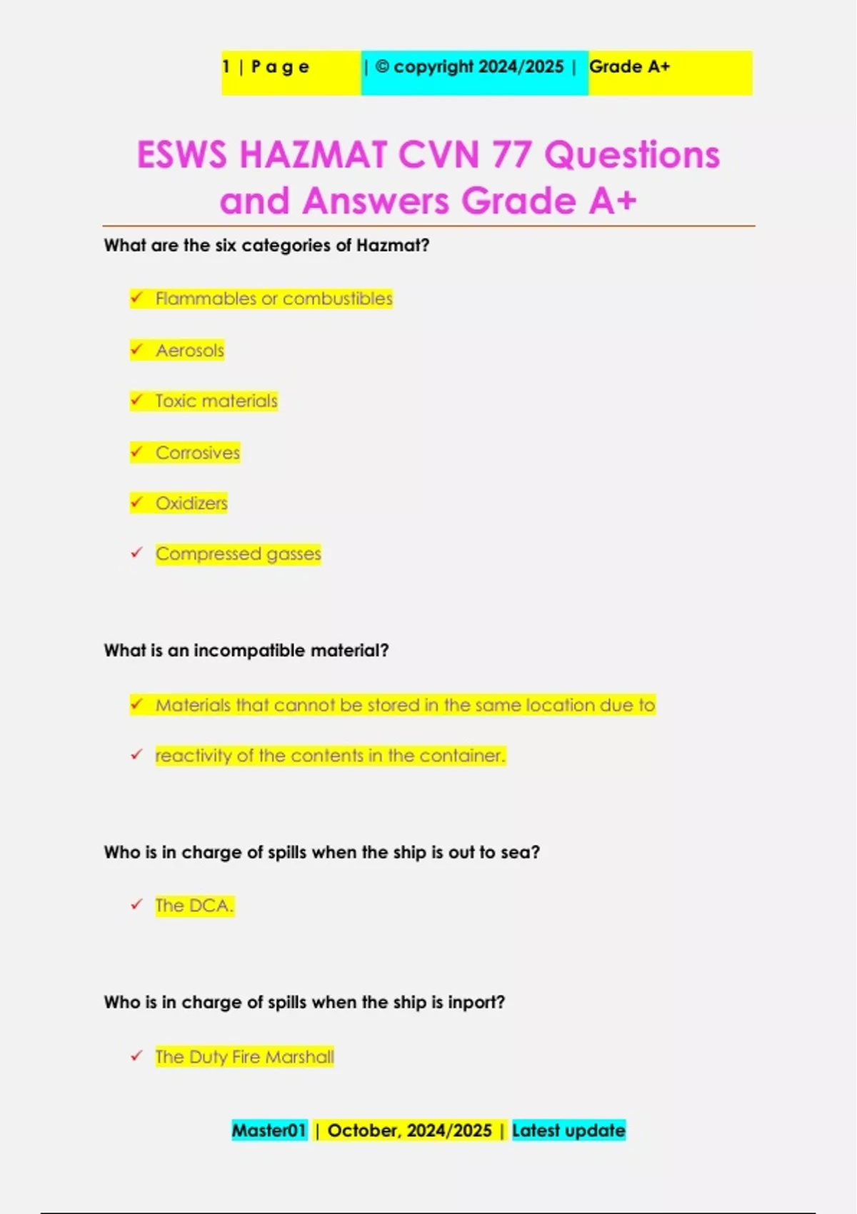 ESWS HAZMAT CVN 77 Questions and Answers Grade A+