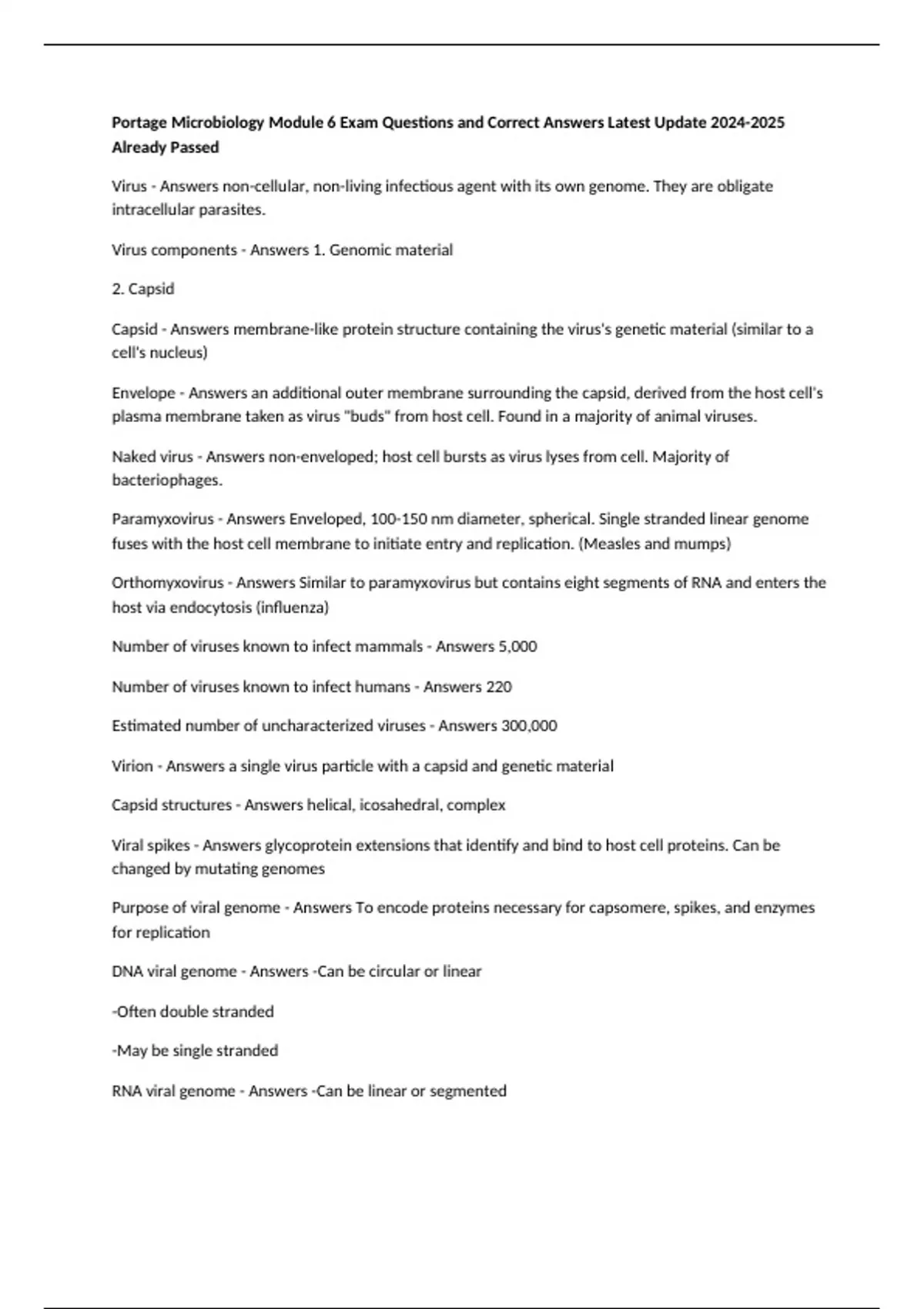 Portage Microbiology Module 6 Exam Questions and Correct Answers Latest Update Already Passed Virus - Answers non-cellular, non-living infectious agent with its own genome. They are obligate intracellular parasites. Virus components - Answers 1. Genomic material 2. Capsid Capsid - Answers membrane-like protein structure containing the virus's genetic material (similar to a cell's nucleus) Envelope - Answers an additional outer membrane surrounding the capsid, derived from the host cell's plasma membrane taken as virus "buds" from host cell. Found in a majority of animal viruses. Naked virus - Answers non-enveloped; host cell bursts as virus lyses from cell. Majority of bacteriophages. Paramyxovirus - Answers Enveloped, 100-150 nm diameter, spherical. Single stranded linear genome fuses with the host cell membrane to initiate entry and replication. (Measles and mumps) Orthomyxovirus - Answers Similar to paramyxovirus but contains eight segments of RNA and enters the host via endocytosis (influenza) Number of viruses known to infect mammals - Answers 5,000 Number of viruses known to infect humans - Answers 220 Estimated number of uncharacterized viruses - Answers 300,000 Virion - Answers a single virus particle with a capsid and genetic material Capsid structures - Answers helical, icosahedral, complex Viral spikes - Answers glycoprotein extensions that identify and bind to host cell proteins. Can be changed by mutating genomes Purpose of viral genome - Answers To encode proteins necessary for capsomere, spikes, and enzymes for replication DNA viral genome - Answers -Can be circular or linear -Often double stranded -May be single stranded RNA viral genome - Answers -Can be linear or segmented -Often single stranded -May be double stranded Human genome size - Answers 3 billion base pairs; 25,000 genes Viral genome size - Answers 7700-2.5 million base pairs; 300 genes Central dogma of biology - Answers DNA is transcribed into mRNA, which is translated by ribosomes into making proteins Protein encoding for double-stranded viral DNA - Answers Same as for cells; DNA-->transcription-->mRNA-->protein Protein encoding for single-stranded viral DNA - Answers Complementary DNA is built-->transcription-->mRNA-->protein Protein encoding for ssRNA+ viruses - Answers mRNA-like genome is immediately ready for translation. (polio, rubella, West Nile encephalitis) Protein encoding for ssRNA- viruses - Answers Genome is complementary to mRNA. Transcription by RNA-dependent RNA polymerases-->mRNA-->proteins (influenza, measles, ebola, rabies) Protein encoding for retroviruses - Answers mRNA-like genome is converted to DNA form by reverse transcriptase--->DNA is inserted in host cell's genome-->transcription-->mRNA-->protein (HIV) Protein encoding for dsRNA viruses - Answers Double-stranded RNA is unwound by RNA-dependent RNA polymerase to single-stranded mRNA-->protein Viral replication - Answers When virus uses the host cell's resources (amino acids, nucleotides, enzymes, and organelles) to make new virions 6 steps to viral replication - Answers 1. Attachment 2. Entry 3. Uncoating 4. Replication 5. Assembly 6. Release Attachment - Answers Virus attaches to host cell via capsid proteins for naked viruses or spike proteins for enveloped Entry by fusion - Answers In enveloped viruses only. Virus binds to receptors on host cell membrane and fuses with it. Host cell cytoplasmic enzymes break down viral capsid and the viral genome is released. Entry by endocytosis - Answers In enveloped or naked viruses. Virus binds to receptors on host cell membrane. Virus is engulfed into endocytic vesicle, enzymes break down capsid and genome is released Uncoating - Answers Breaking down the capsid to release viral proteins and genome Replication - Answers Virus synthesizes its genome and transcribes mRNA to translate viral proteins Assembly - Answers capsids form around viral genome Release - Answers virions either bud off host cell, creating their envelope or they lyse the cell creating naked virions Tropism - Answers Specificity of a virus to bind to its host cell. Ebola has broad tropism Acute viral infection - Answers replication peaks quickly, immune system fights it off, and the infection ends Latent persistent infection - Answers Replication peaks and declines but immune system can't clear it. Quiet periods are when replication is low. Chronic persistent infection - Answers replication is initially low and a person can be asymptomatic but infectious. Virion replication ramps up after several years. (HIV) Provirus - Answers Made when reverse transcripted DNA is inserted in host cell genome, provirus is then transcribed to make the viral genome Number of viral particles that can be produced from a single infected cell - Answers Up to 10,000 Phage - Answers Virus that only infects bacterial cells Significance of bacteriophages - Answers -They can introduce new genetic information and genetic combinations into human microflora -Could be used against antibiotic resistant bacteria, since some can kill prokaryotic cells -Can be used in lab and molecular biology since they have the ability to insert new genetic material