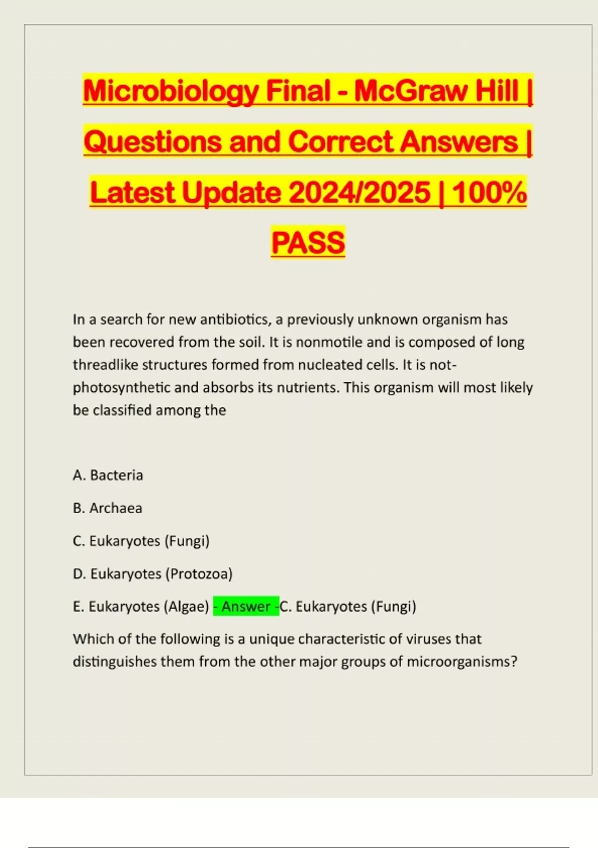Microbiology Final - McGraw Hill | Questions and Correct Answers | Latest Update 2024/2025 | 100% PASS In a search for new antibiotics, a previously unknown organism has been recovered from the soil. It is nonmotile and is composed of long threadlike structures formed from nucleated cells. It is notphotosynthetic and absorbs its nutrients. This organism will most likely be classified among the A. Bacteria B. Archaea C. Eukaryotes (Fungi) D. Eukaryotes (Protozoa) E. Eukaryotes (Algae) - Answer -C. Eukaryotes (Fungi) Which of the following is a unique characteristic of viruses that distinguishes them from the other major groups of microorganisms?A. lack a nucleus B. contain genetic material C. lack cell structure D. cause human disease