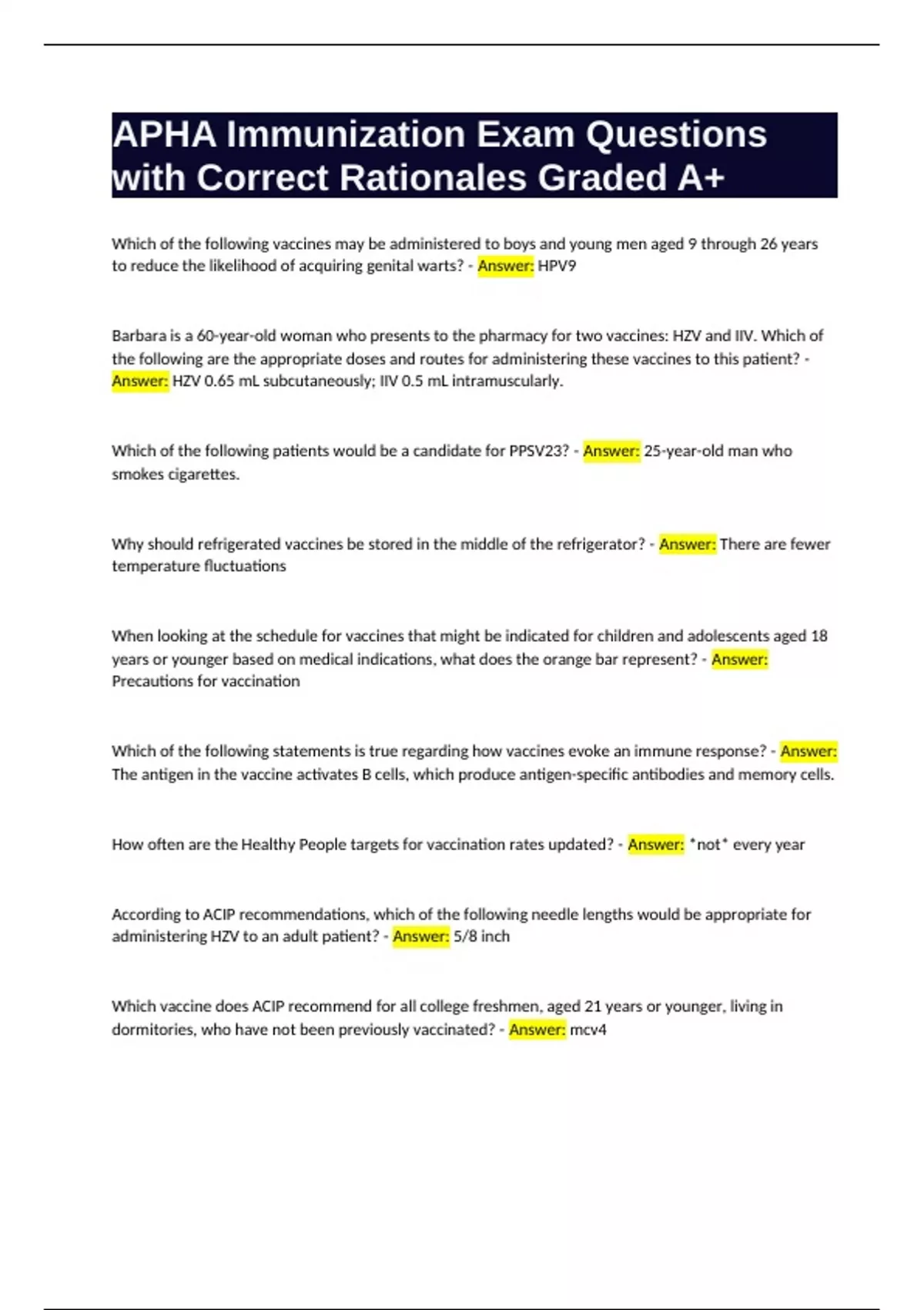 APHA Immunization Exam Questions with Correct Rationales Graded A+