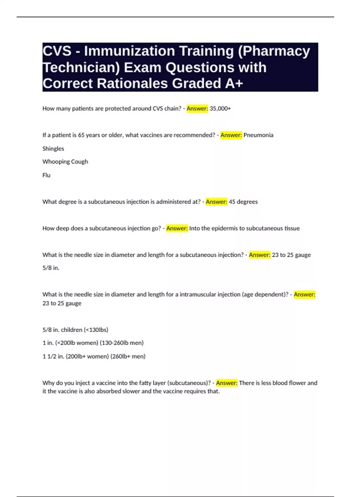 CVS - Immunization Training (Pharmacy Technician) Exam Questions with Correct Rationales Graded A+