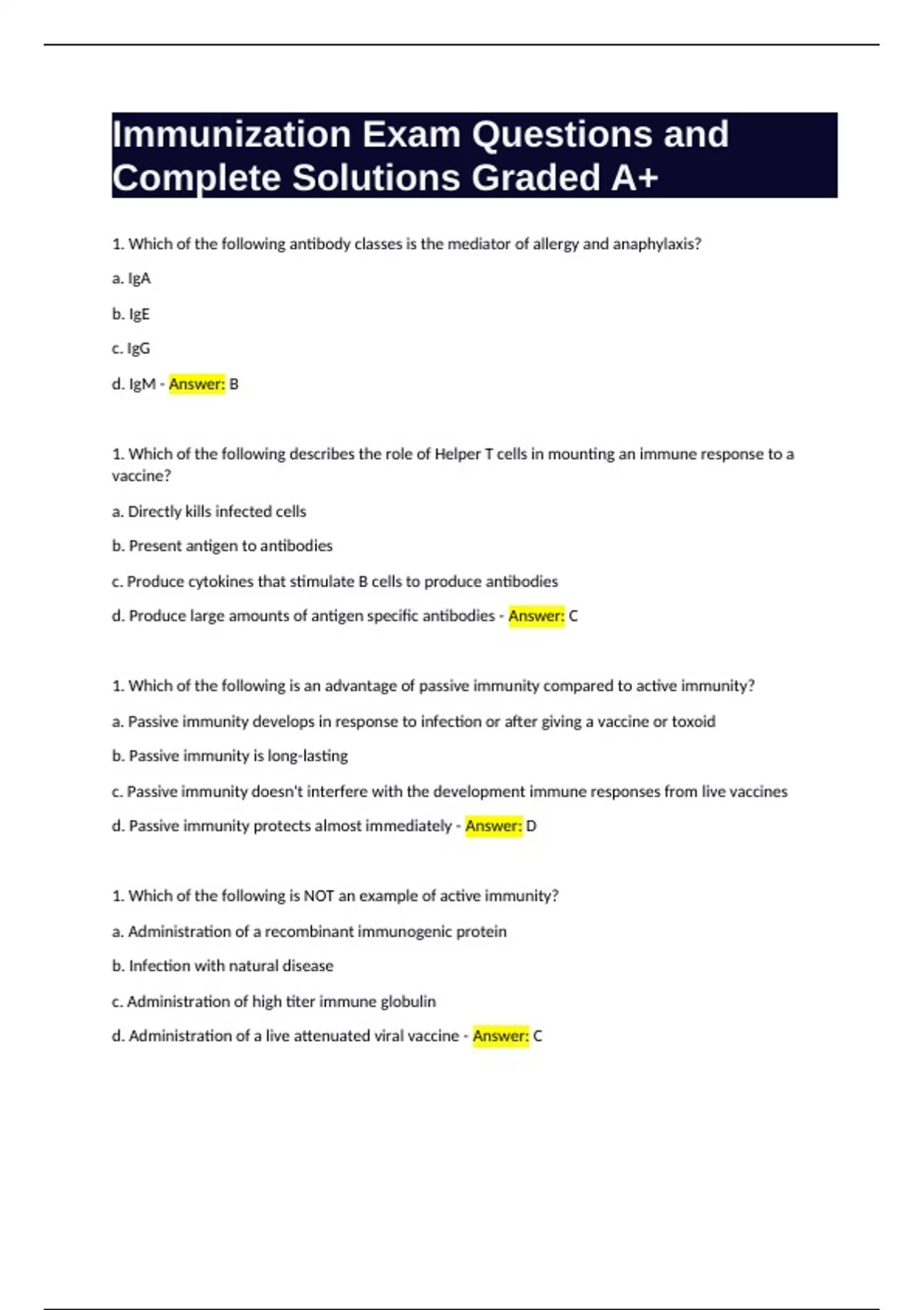 Immunization Exam Questions and Complete Solutions Graded A+.