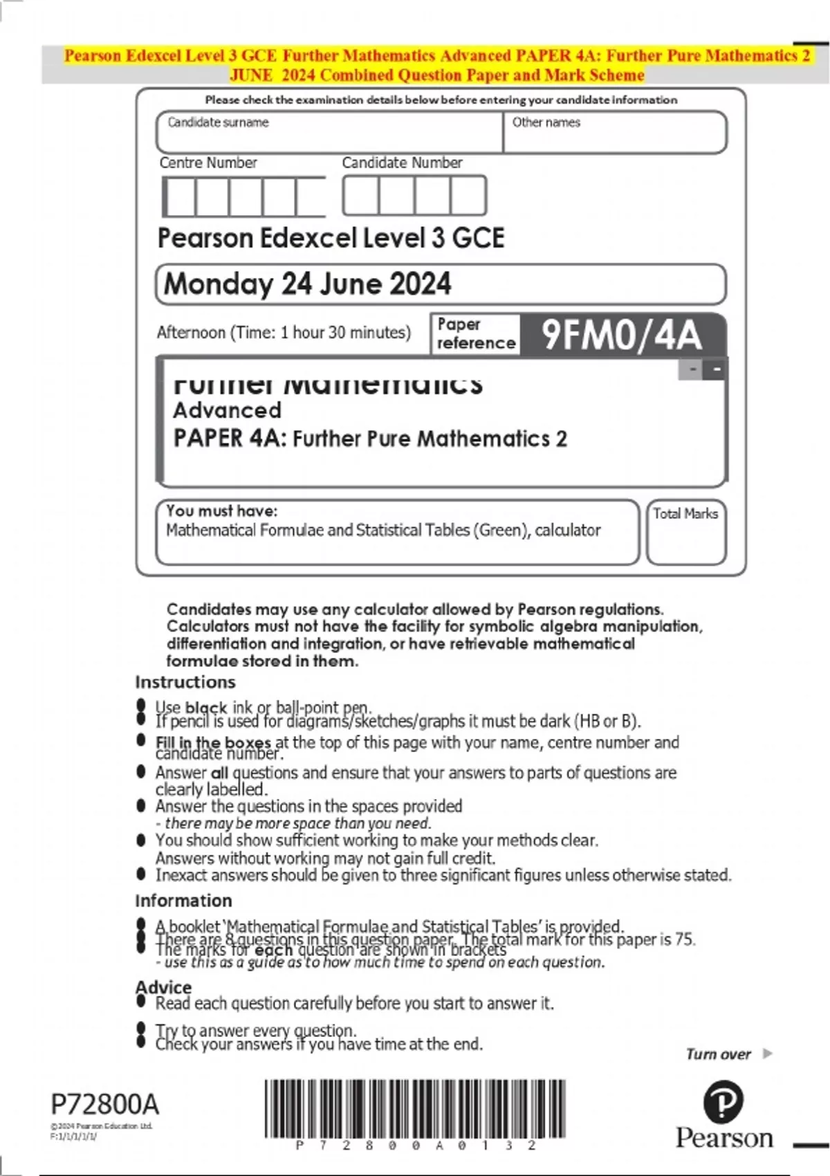 Pearson Edexcel Level 3 GCE Further Mathematics Advanced PAPER 4A: Further Pure Mathematics 2 JUNE 2024 Combined Question Paper and Mark Scheme