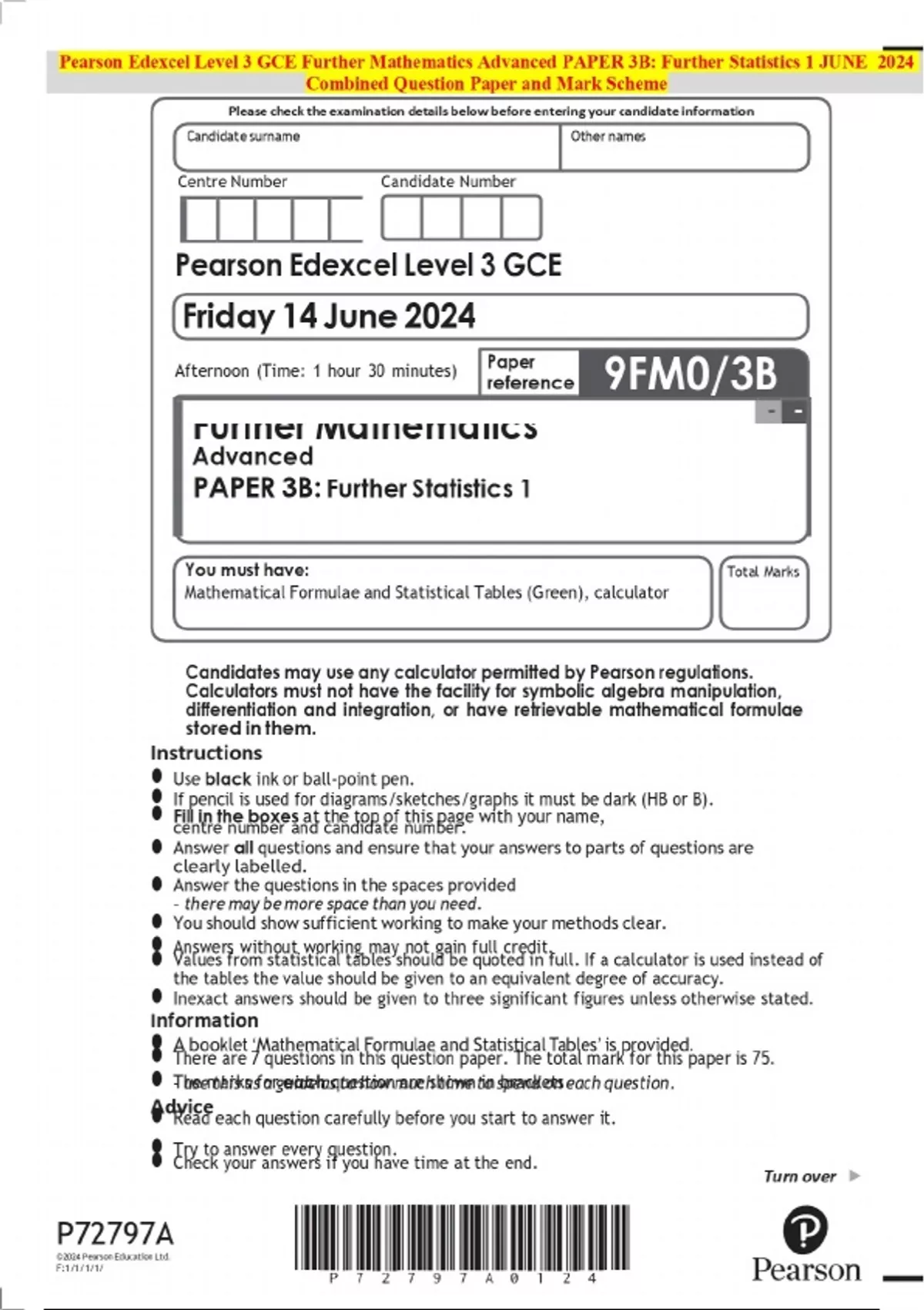 Pearson Edexcel Level 3 GCE Further Mathematics Advanced PAPER 3B: Further Statistics 1 JUNE 2024 Combined Question Paper and Mark Scheme