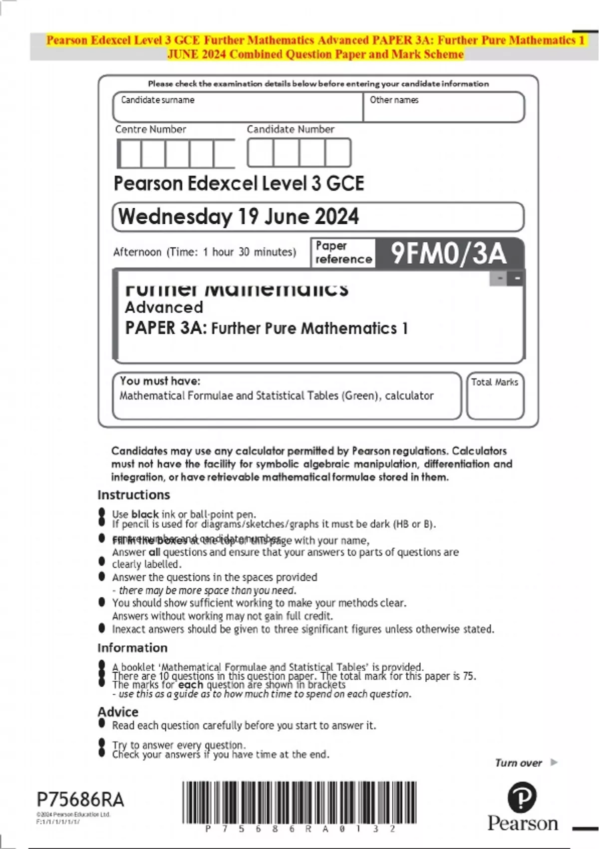 Pearson Edexcel Level 3 GCE Further Mathematics Advanced PAPER 3A: Further Pure Mathematics 1 JUNE 2024 Combined Question Paper and Mark Scheme