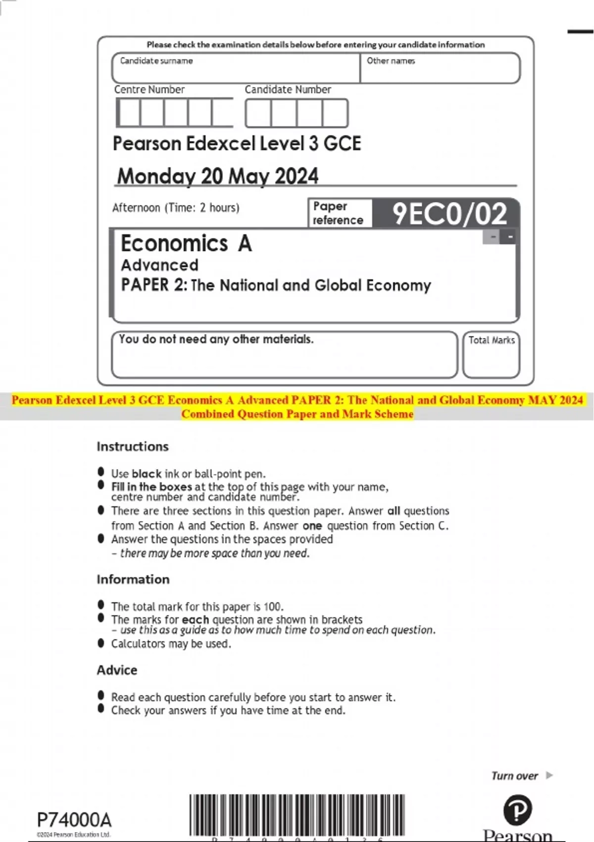 Pearson Edexcel Level 3 GCE Economics A Advanced PAPER 2: The National and Global Economy MAY 2024 Combined Question Paper and Mark Scheme