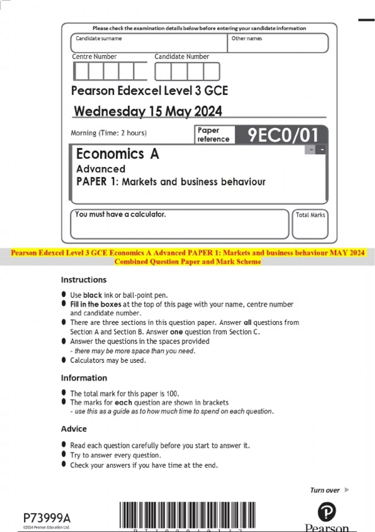 Pearson Edexcel Level 3 GCE Economics A Advanced PAPER 1: Markets and business behaviour MAY 2024 Combined Question Paper and Mark Scheme