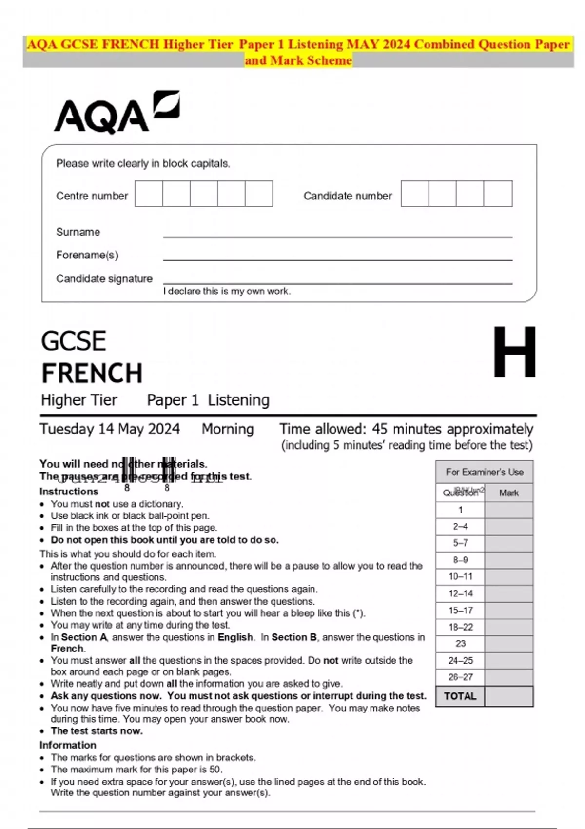 AQA GCSE FRENCH Higher Tier Paper 1 Listening MAY 2024 Combined Question Paper and Mark Scheme