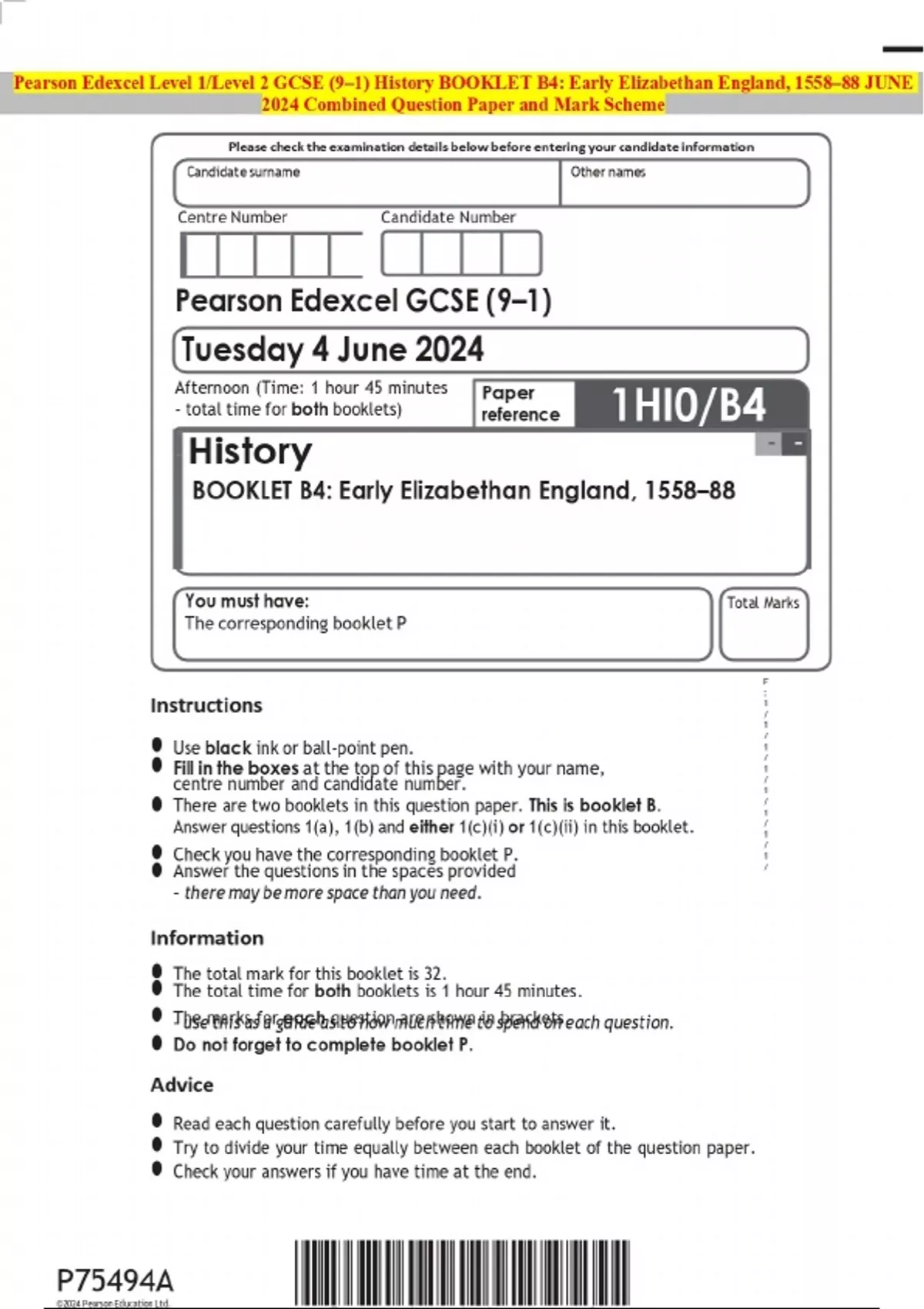 Pearson Edexcel Level 1/Level 2 GCSE (9–1) History BOOKLET B4: Early Elizabethan England, 1558–88 JUNE 2024 Combined Question Paper and Mark Scheme