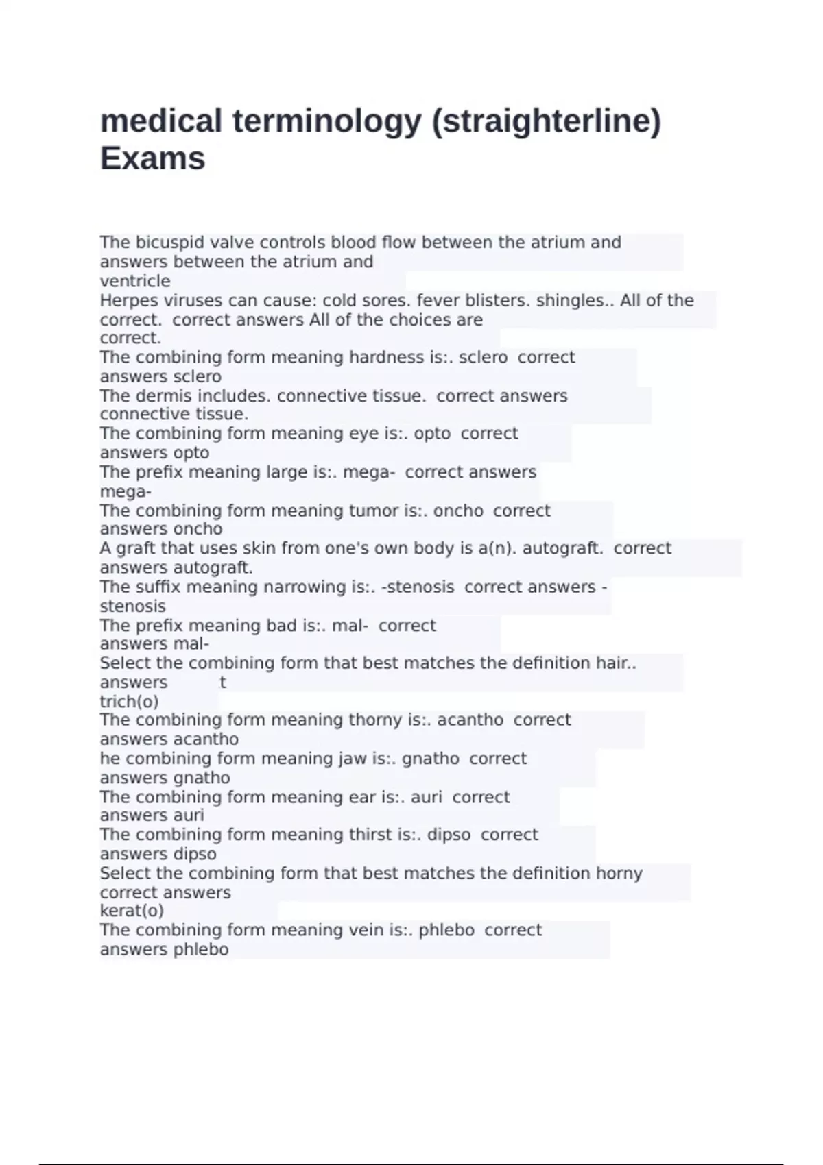 The bicuspid valve controls blood flow between the atrium and ventricle correct answers between the atrium and ventricle Herpes viruses can cause: cold sores. fever blisters. shingles.. All of the choices are correct. correct answers All of the choices are correct. The combining form meaning hardness is:. sclero correct answers sclero The dermis includes. connective tissue. correct answers connective tissue. The combining form meaning eye is:. opto correct answers opto The prefix meaning large is:. mega- correct answers mega- The combining form meaning tumor is:. oncho correct answers oncho A graft that uses skin from one's own body is a(n). autograft. correct answers autograft. The suffix meaning narrowing is:. -stenosis correct answers -stenosis The prefix meaning bad is:. mal- correct answers mal- Select the combining form that best matches the definition hair.. trich(o) correct answers trich(o) The combining form meaning thorny is:. acantho correct answers acantho he combining form meaning jaw is:. gnatho correct answers gnatho The combining form meaning ear is:. auri correct answers auri The combining form meaning thirst is:. dipso correct answers dipso Select the combining form that best matches the definition horny tissue.. kerat(o) correct answers kerat(o) The combining form meaning vein is:. phlebo correct answers phlebo