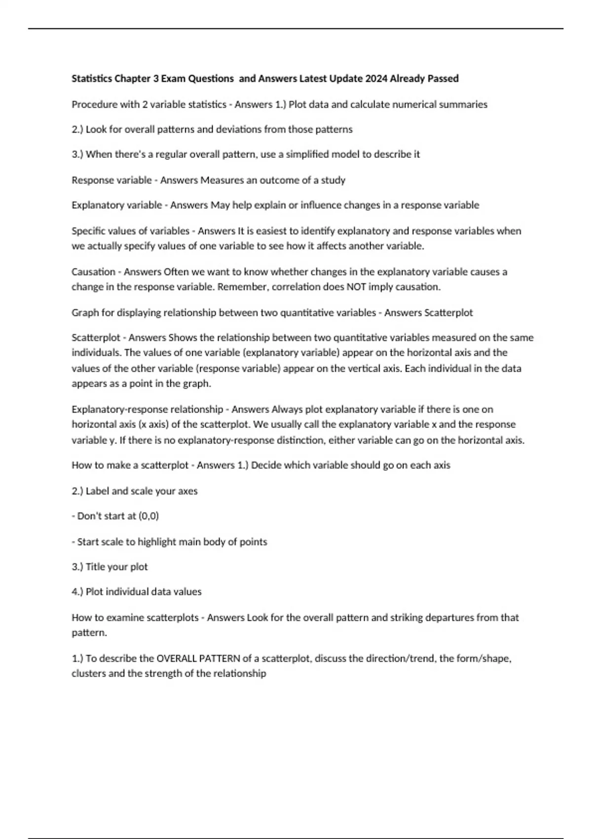 Statistics Chapter 3 Exam Questions and Answers Latest Update 2024 Already Passed Procedure with 2 variable statistics - Answers 1.) Plot data and calculate numerical summaries 2.) Look for overall patterns and deviations from those patterns 3.) When there's a regular overall pattern, use a simplified model to describe it Response variable - Answers Measures an outcome of a study Explanatory variable - Answers May help explain or influence changes in a response variable Specific values of variables - Answers It is easiest to identify explanatory and response variables when we actually specify values of one variable to see how it affects another variable. Causation - Answers Often we want to know whether changes in the explanatory variable causes a change in the response variable. Remember, correlation does NOT imply causation. Graph for displaying relationship between two quantitative variables - Answers Scatterplot Scatterplot - Answers Shows the relationship between two quantitative variables measured on the same individuals. The values of one variable (explanatory variable) appear on the horizontal axis and the values of the other variable (response variable) appear on the vertical axis. Each individual in the data appears as a point in the graph. Explanatory-response relationship - Answers Always plot explanatory variable if there is one on horizontal axis (x axis) of the scatterplot. We usually call the explanatory variable x and the response variable y. If there is no explanatory-response distinction, either variable can go on the horizontal axis. How to make a scatterplot - Answers 1.) Decide which variable should go on each axis 2.) Label and scale your axes - Don't start at (0,0) - Start scale to highlight main body of points 3.) Title your plot 4.) Plot individual data values How to examine scatterplots - Answers Look for the overall pattern and striking departures from that pattern. 1.) To describe the OVERALL PATTERN of a scatterplot, discuss the direction/trend, the form/shape, clusters and the strength of the relationship 2.) To describe DEPARTURES from the OVERALL PATTERN discuss outliers (an individual that falls outside the overall pattern of the relationship) Form/shape - Answers The general shape of the graph Ex: linear relationships/curved relationships/outliers/clusters Direction/trend - Answers Draw oval around data and find the slope of the major axis: negative slope means negative trend while positive slope means positive trend If relationship has a clear direction, we speak of positive association (high values of one variable tend to occur together) or negative association (high values of one variable tend to occur with low values of the other variable) Strength (heteroscedasticity) - Answers How scattered is the data (based on the oval) How close the points in a scatterplot lie to a simple form such as a line - Thin hot dog shape = strong - Football shape = moderate - Basketball shape = week - Fan out = differs for different values of explanatory variable *Correlation coefficient Cluster - Answers There are a bunch of data points together - Name ranges of each variable where cluster appears Outlier - Answers There's a lot of white space around the data point - Outlier in response variable (y) - Outlier in explanatory variable - Outlier in both - Outlier b/c doesn't follow the overall pattern/trend Positive association - Answers Positive association, negative association Two variables have a positive association when above-average values of one tend to accompany above-average values of the other, and when below-average values also tend to occur together. Negative association - Answers Two variables have a negative association when above-average values of one tend to accompany bleow-average values of the other Problems w/ positive and negative association - Answers Not all relationships have a clear direction that we can describe as a positive association or negative association Caution w/ scatterplots - Answers Association does not imply causation because there may be other variables lurking in the background that contribute to the relationship between two variables Linear relationships - Answers Linear relationships are important because a straight line is a simple pattern that is quite common; a linear relationship is strong if the points lie close to a straight line and weak if they are widely scattered about a line. Problem with judging linear relationships - Answers Our eyes are not a good judge of strength of a linear relationship. It is easy to be fooled by different scales are the amount of space around the cloud of points. We need to use a numerical measure to supplement the graph. Correlation is the measure we use. Correlation (coefficient) - Answers The correlation r measures the direction and strength of the linear relationship between two quantitative variables. - The correlation r is always a number b/w -1 and 1. - Correlation indicates the direction of a linear relationship by its sign: r > 0 for a positive association and r <0 for a negative association - Values of r near 0 indicate a very weak linear relationship. The strength of the linear relationship increases as r moves away from 0 toward -1 or 1. - The extreme values r = -1 and r = 1 occur only in the case of a perfect linear relationship, when the points lie exactly along a straight line How to calculate the correlation - Answers Suppose that we have data on variables x and y for n individuals. The means and the standard deviations of the two variables are xbar and sx for the x-values and ybar and sy for the y values. The correlation r between x and y is 1/(n-1) times the sum of the products of zx and zy (Use calculator: 6 1 4) Another meaning of correlation - Answers The average of the products of the standardized scores Problems with correlation calculation - Answers A value of r close to 1 or -1 does not guarantee a linear relationship between two variables. A scatterplot with a clear cu