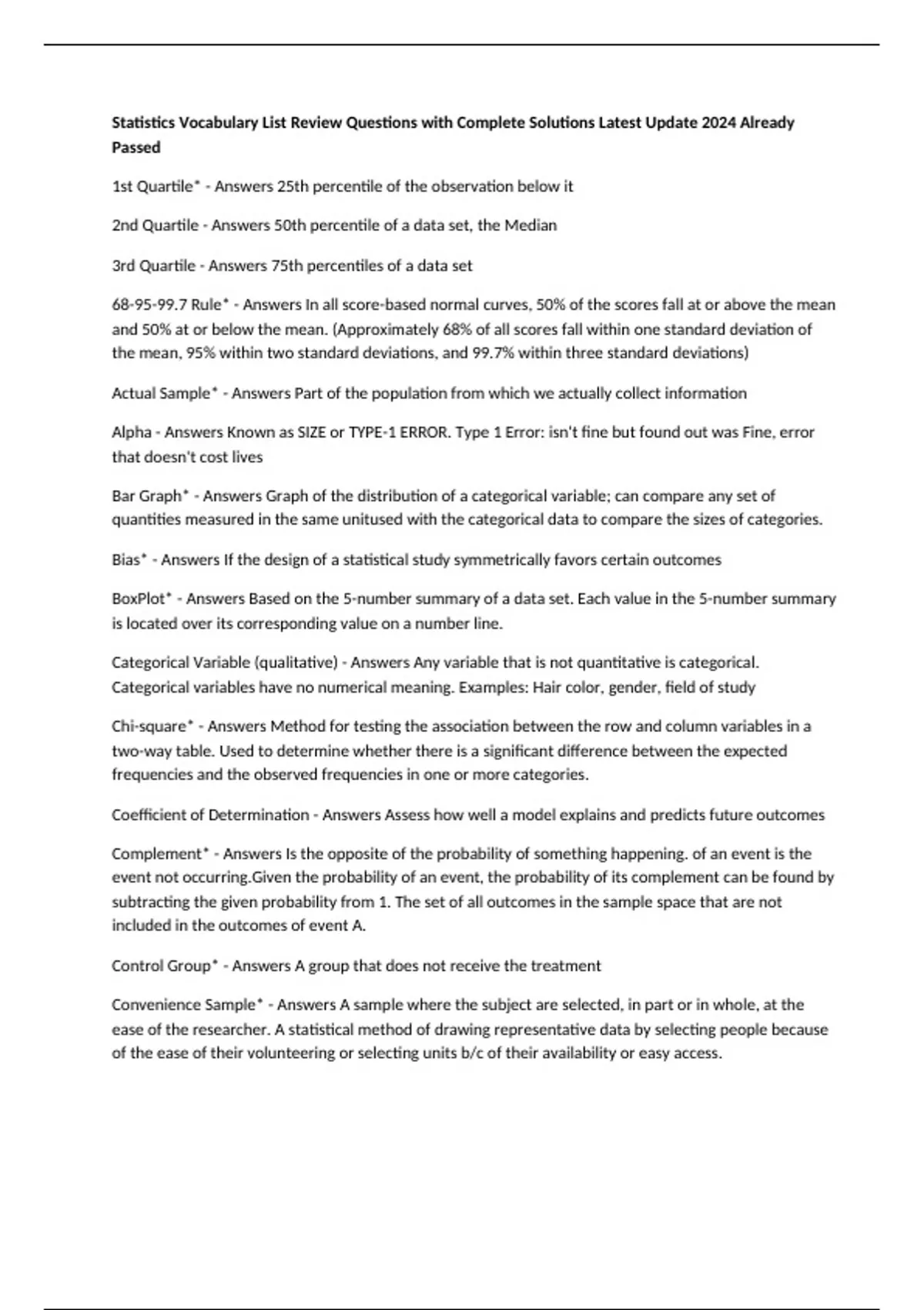 Convenience Sample* - Answers A sample where the subject are selected, in part or in whole, at the