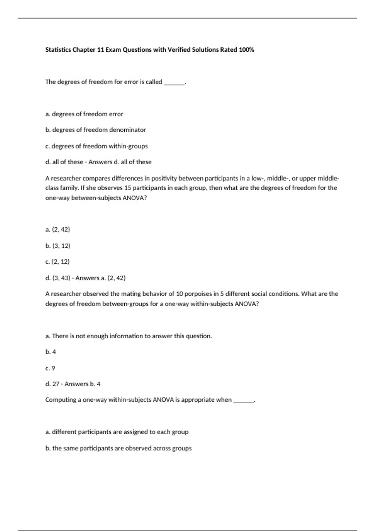 Statistics Chapter 11 Exam Questions with Verified Solutions Rated 100% The degrees of freedom for error is called ______. a. degrees of freedom error b. degrees of freedom denominator c. degrees of freedom within-groups d. all of these - Answers d. all of these A researcher compares differences in positivity between participants in a low-, middle-, or upper middle-class family. If she observes 15 participants in each group, then what are the degrees of freedom for the one-way between-subjects ANOVA? a. (2, 42) b. (3, 12) c. (2, 12) d. (3, 43) - Answers a. (2, 42) A researcher observed the mating behavior of 10 porpoises in 5 different social conditions. What are the degrees of freedom between-groups for a one-way within-subjects ANOVA? a. There is not enough information to answer this question. b. 4 c. 9 d. 27 - Answers b. 4 Computing a one-way within-subjects ANOVA is appropriate when ______. a. different participants are assigned to each group b. the same participants are observed across groups c. the levels of one or more independent variables are manipulated d. all of these - Answers b. the same participants are observed across groups A researcher conducts a study using the one-way between-subjects ANOVA. He computes = 120 and = 200. What is the effect size for this test using eta-squared? a. .38 b. There is not enough information to answer this question. c. 1.67 d. .60 - Answers a. .38 Using a between-subjects ANOVA design, ______. a. the same participants are observed in each group b. data are not analyzed between groups c. n participants are observed k times d. n · k participants are each observed one time - Answers d. n · k participants are each observed one time Post hoc tests are computed ______. a. following a significant ANOVA test to make pairwise comparisons b. to determine which set of degrees of freedom can be attributed to the variability between-groups c. to determine if groups means differ, even for tests in which the decision is to retain the null hypothesis d. prior to conducting a hypothesis test - Answers a. following a significant ANOVA test to make pairwise comparisons Which of the following is a measure of proportion of variance for a one-way between-subjects ANOVA? a. omega-squared b. both A and B c. eta-squared d. estimated Cohen's d - Answers b. both A and B The following result is reported for a one-way within-subjects ANOVA: F(2, 27) = 3.20, p < .05 ( = .14). Which value in the summary suggests that the design was within-subjects? a. the test statistic value b. the p value c. the partial estimate for eta-squared d. the degrees of freedom - Answers c. the partial estimate for eta-squared The following is a summary of a one-way between-subjects ANOVA: F(2, 37) = 3.42, p < .05, = .12. How many pairwise comparisons need to be made for this ANOVA result? a. 12 b. 2 c. 4 d. 3 - Answers d. 3 In a study with 4 groups and 10 participants in each group, the sum of squares for the between-groups source of variation is 60. What is the value for the mean square between-groups in this study? a. 10 b. 20 c. 1.67 d. 15 - Answers b. 20 Which of the following is an assumption for computing a one-way within-subjects ANOVA? a. The population being sampled from is positively skewed. b. Different participants were observed in each group. c. Independent observations were made within groups, but not between groups. d. all of these - Answers c. Independent observations were made within groups, but not between groups. A researcher conducts a study in which k = 5 and N = 80. What are the degrees of freedom between-groups for the one-way between-subjects ANOVA? a. 5 b. 75 c. 395 d. 4 - Answers d. 4 A researcher conducts two studies using the one-way between-subjects ANOVA. The sum of squares between groups is larger in Study 1 than in Study 2; the sum of squares total is smaller in Study 1 than in Study 2. Using eta-squared, in which study will the effect size be larger? a. There is not enough information to answer this question. b. Study 1 c. Study 2 - Answers b. Study 1 Which source of variation is computed using a one-way within-subjects ANOVA, but not a one-way between-subjects ANOVA? a. within-groups variation b. between-persons variation c. between-groups variation