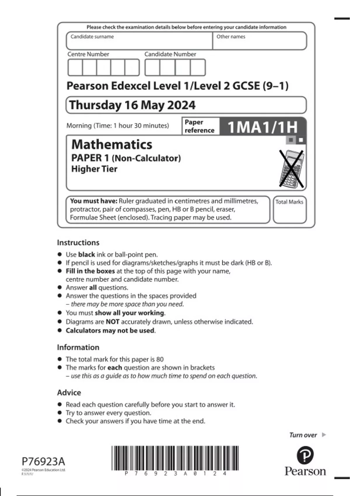 Pearson Edexcel Level 1/Level 2 GCSE (9–1) Mathematics PAPER 1 Higher Tier JUNE 2024 QUESTION PAPER