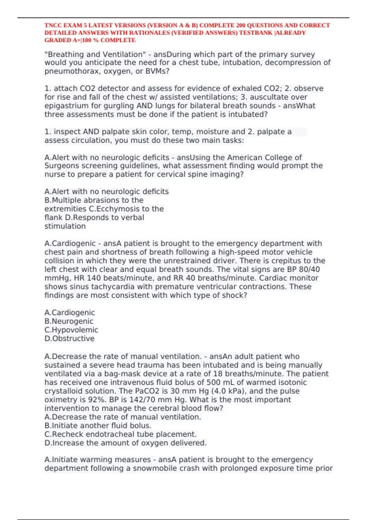 TNCC EXAM 5 LATEST VERSIONS (VERSION A & B) COMPLETE 200 QUESTIONS AND CORRECTTNCC EXAM 5 LATEST VERSIONS (VERSION A & B) COMPLETE 200 QUESTIONS AND CORRECT