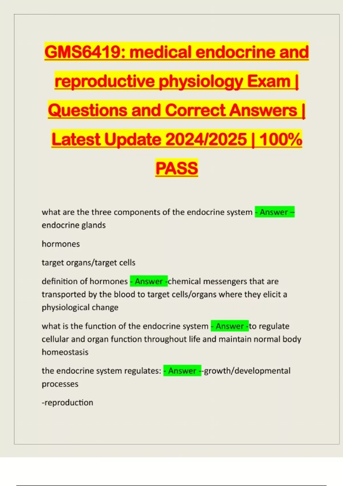 GMS6419: medical endocrine and reproductive physiology Exam | Questions and Correct Answers | Latest Update 2024/2025 | 100% PASS what are the three components of the endocrine system - Answer – endocrine glands hormones target organs/target cells definition of hormones - Answer -chemical messengers that are transported by the blood to target cells/organs where they elicit a physiological change what is the function of the endocrine system - Answer -to regulate cellular and organ function throughout life and maintain normal body homeostasis the endocrine system regulates: - Answer --growth/developmental processes -reproduction-energy balance/metabolism -body temperature -stress responses -sodium/potassium/calcium/phosphate -water and sodium balance -cardiovascular regulation -GI system where are hormones made - Answer -by the glands how are the endocrine and neurocrine systems different - Answer - there is no endocrine gland so the hormone is released from the nerve terminal instead where are hormones released in the