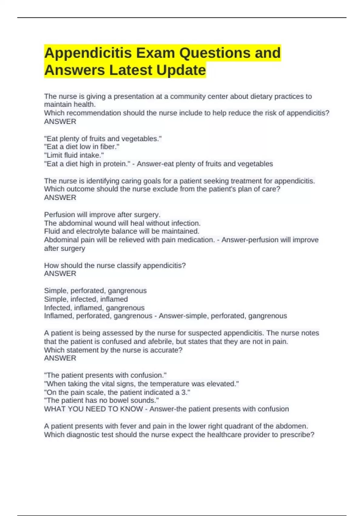 Appendicitis Exam Questions and Answers Latest Update