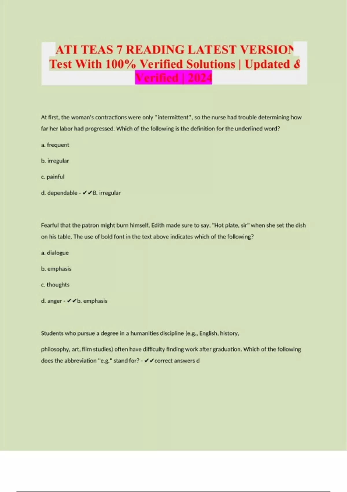 ATI TEAST 7 READING LATEST VERSION WITH 100% VERIFIED QUETIONS AND ANSWERS//ALREADY GRADED A+//2024 UPDATED