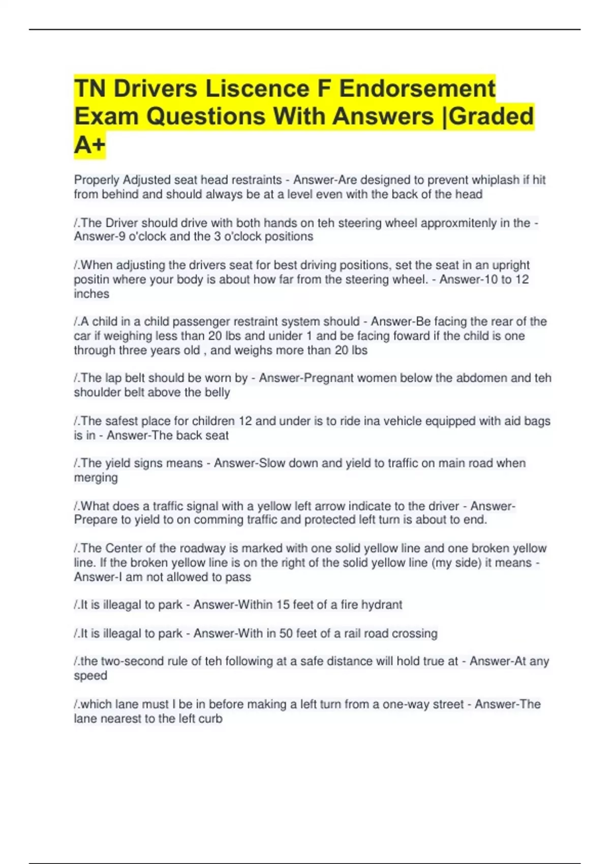 TN Drivers Liscence F Endorsement Exam Questions With Answers |Graded A+ Properly Adjusted seat head restraints - Answer-Are designed to prevent whiplash if hit from behind and should always be at a level even with the back of the head /.The Driver should drive with both hands on teh steering wheel approxmitenly in the - Answer-9 o'clock and the 3 o'clock positions /.When adjusting the drivers seat for best driving positions, set the seat in an upright positin where your body is about how far from the steering wheel. - Answer-10 to 12 inches /.A child in a child passenger restraint system should - Answer-Be facing the rear of the car if weighing less than 20 lbs and unider 1 and be facing foward if the child is one through three years old , and weighs more than 20 lbs /.The lap belt should be worn by - Answer-Pregnant women below the abdomen and teh shoulder belt above the belly /.The safest place for children 12 and under is to ride ina vehicle equipped with aid bags is in - Answer-The back seat /.The yield signs means - Answer-Slow down and yield to traffic on main road when merging /.What does a traffic signal with a yellow left arrow indicate to the driver - Answer-Prepare to yield to on comming traffic and protected left turn is about to end. /.The Center of the roadway is marked with one solid yellow line and one broken yellow line. If the broken yellow line is on the right of the solid yellow line (my side) it means - Answer-I am not allowed to pass /.It is illeagal to park - Answer-Within 15 feet of a fire hydrant /.It is illeagal to park - Answer-With in 50 feet of a rail road crossing /.the two-second rule of teh following at a safe distance will hold true at - Answer-At any speed /.which lane must I be in before making a left turn from a one-way street - Answer-The lane nearest to the left curb