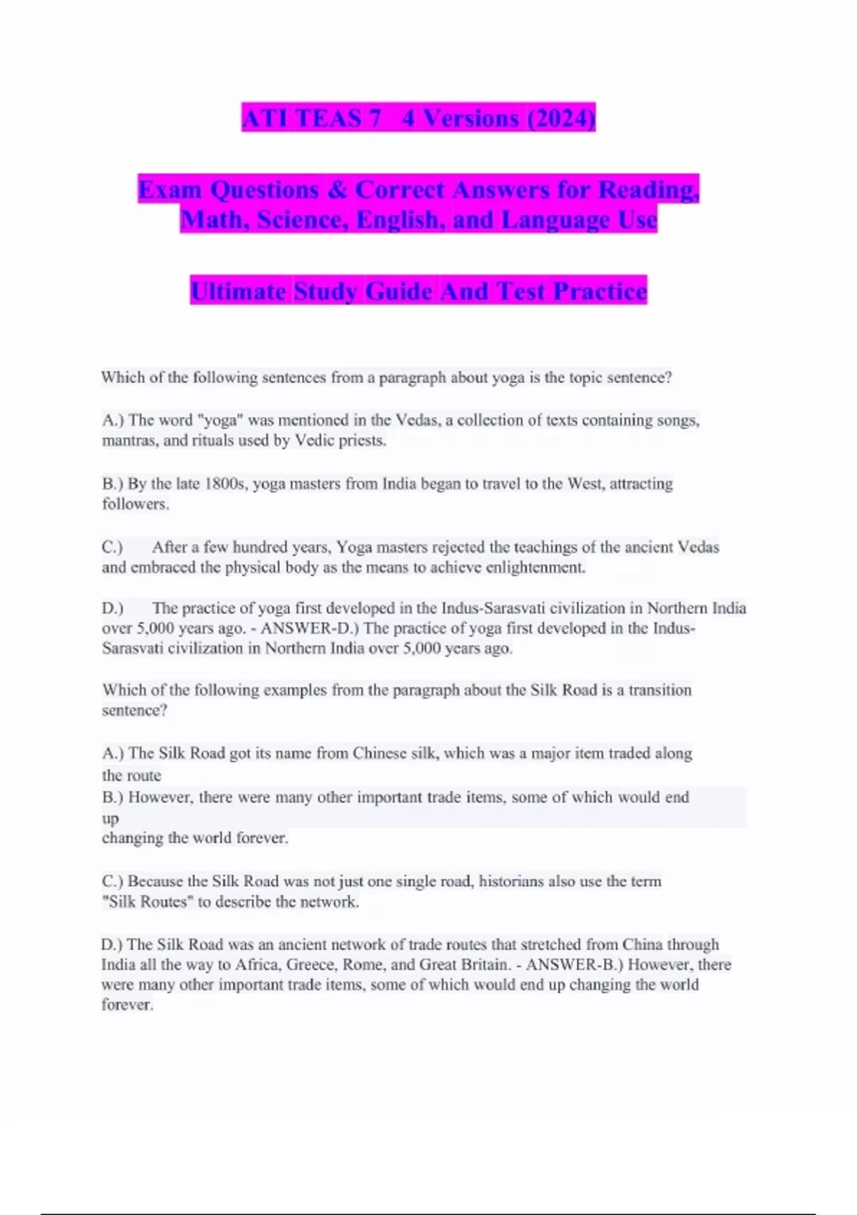 ATI TEAS 7 LATEST Versions (2024) Exam Questions & Correct Answers for Reading, Math, Science, English, and Language Use Ultimate Study Guide And Test Practice