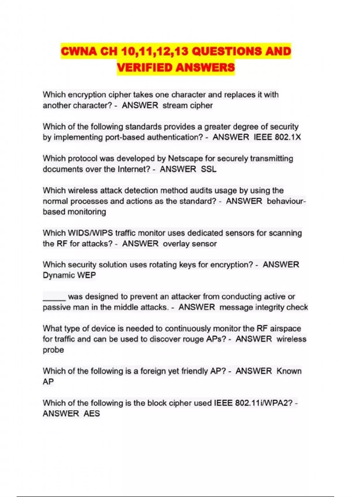 CWNA CH 10,11,12,13 QUESTIONS AND VERIFIED ANSWERS...