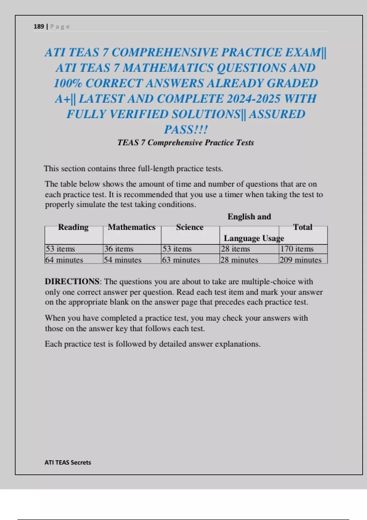 ATI TEAS 7 COMPREHENSIVE PRACTICE EXAM|| ATI TEAS 7 MATHEMATICS QUESTIONS AND 100% CORRECT ANSWERS ALREADY GRADED A+|| LATEST AND COMPLETE WITH FULLY VERIFIED SOLUTIONS|| ASSURED PASS!!!